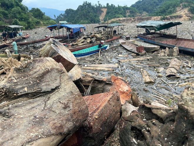 Một số gốc cây to trôi dạt vào khu vực bến thuyền, đập nước, nơi tập trung nhiều hộ dân sinh sống.