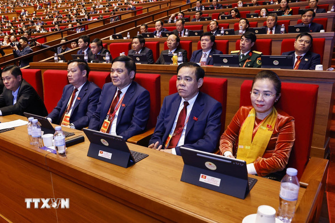 Đoàn đại biểu Đảng bộ tỉnh Nghệ An tham dự phiên thảo luận tại hội trường về các văn kiện Đại hội. (Ảnh: TTXVN)
