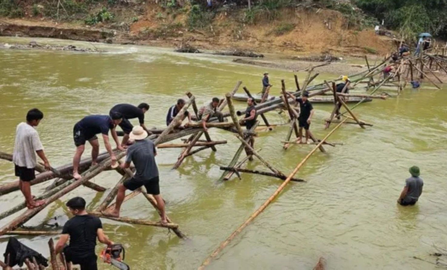 Trên địa bàn tỉnh Nghệ An, đợt lũ lịch sử đầu tháng 10 vừa qua đã cuốn sập nhiều cây cầu, trong đó có cầu cứng Trung Thắng vượt khe Huồi Nguyên. Để đảm bảo đi lại cho người dân, chính quyền xã Yên Hòa đã huy động lực lượng dựng cầu tạm bằng tre, nứa dài hàng trăm mét cạnh vị trí cầu cũ, giúp người dân qua lại an toàn hơn.