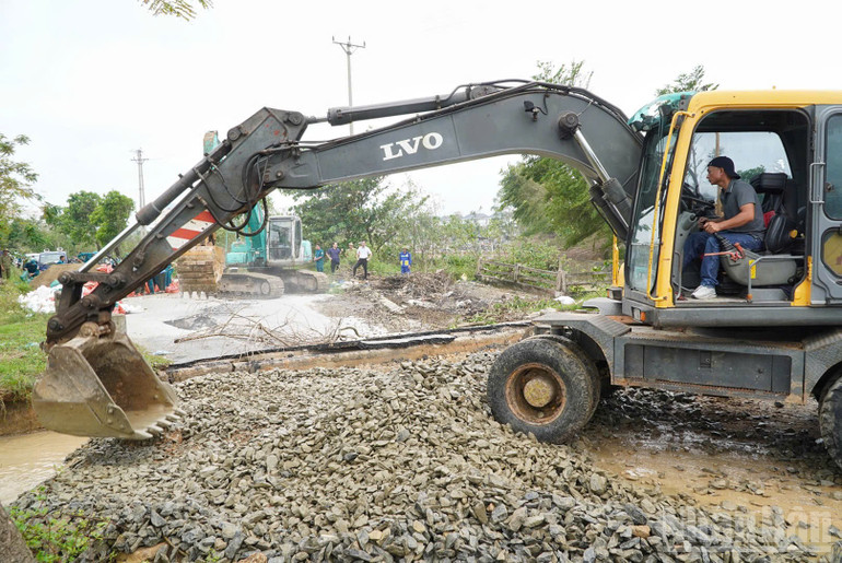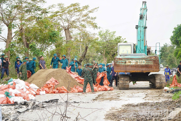 Xe tải, máy xúc, máy ủi được huy động để đổ đất đá bịt điểm vỡ, sau đó tiếp tục gia cố bằng bao cát và rọ đá. Song song với đó, đánh giá mức độ hư hỏng để sớm xây dựng phương án xử lý triệt để tuyến ven sông này.