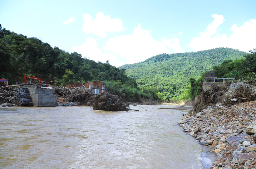 Nước lũ cuốn trôi nhịp cầu Xốp Chạng trên quốc lộ 48C, làm biến dạng hoàn toàn lòng suối khu vực hai bên cầu. (Ảnh: Xuân Tiến/TTXVN)