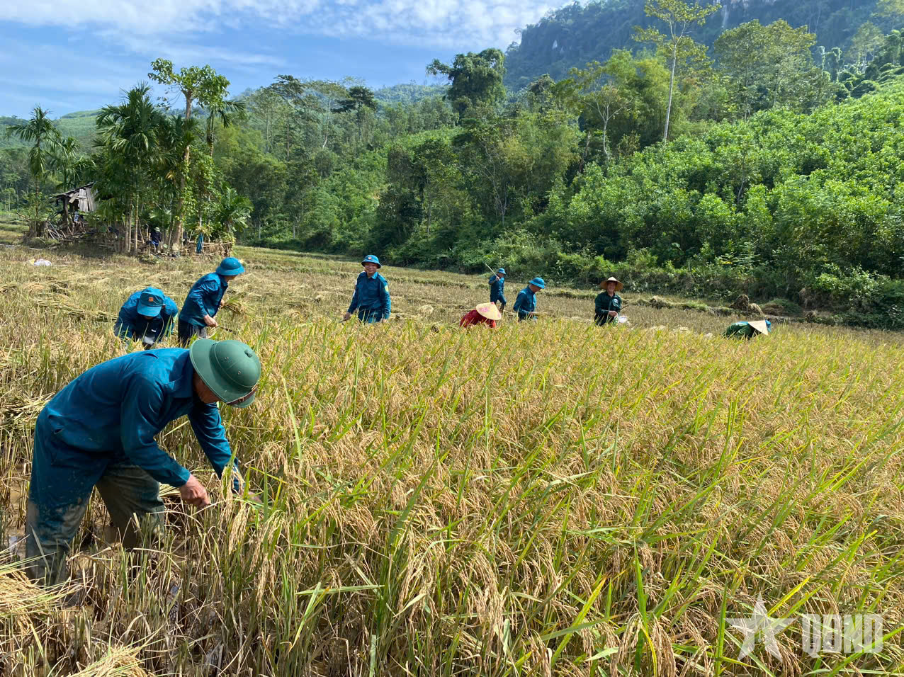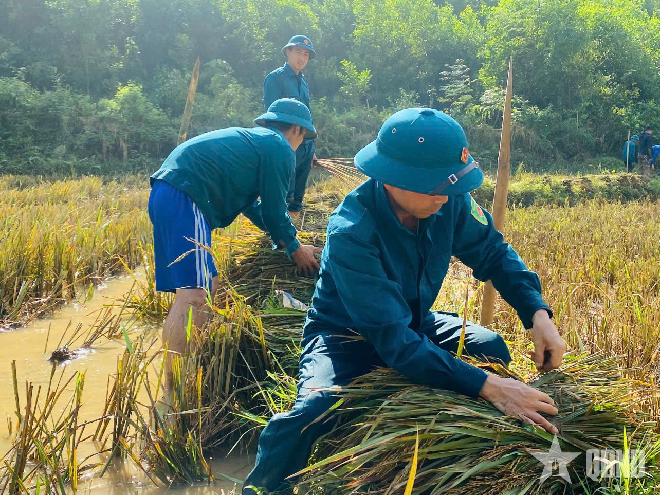 Trên cánh đồng, những chiến sĩ dân quân nhanh tay liềm, vai áo ướt đẫm mồ hôi. Xen lẫn là các đoàn viên thanh niên, người thì gom lúa, người thì vận chuyển. Chỉ sau buổi sáng, hàng chục sào lúa của các gia đình neo đơn đã được thu hoạch gọn gàng. Đặc biệt, nhiều ruộng lúa nằm sâu phía bên kia con suối, muốn vận chuyển về nhà phải lội qua dòng nước đang dâng cao. Không quản ngại khó khăn, dân quân và đoàn viên đã gánh từng bó lúa vượt suối, nước ngập đến ngang người, dòng nước chảy xiết khiến ai nấy phải bám chặt vào nhau để giữ thăng bằng.