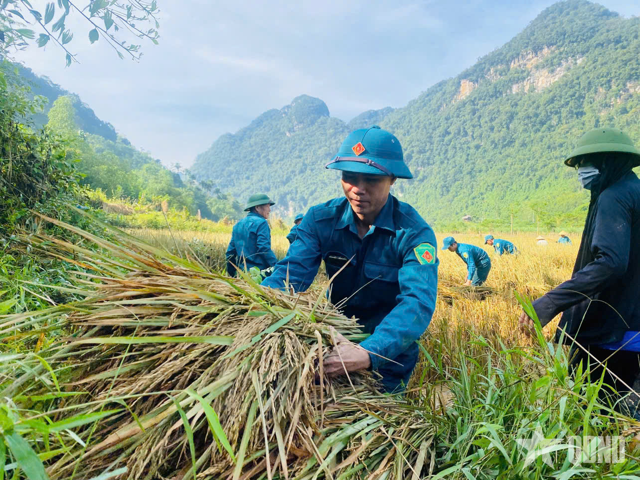 Ông Vi Văn Lâm-lão nông trong xóm-vừa gom bó lúa vừa xúc động chia sẻ: “Cả nhà tôi còn mấy sào lúa chưa gặt. Nếu không kịp gặt, gió bão tràn về thì coi như mất trắng. May có các chú dân quân và thanh niên đến giúp, tôi nhẹ cả gánh lo”.