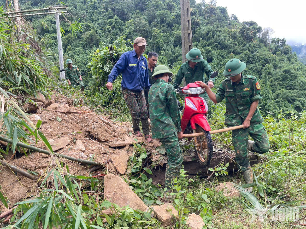 Tại xã Châu Khê, những ngày qua, mưa lũ dồn dập khiến nhiều tuyến đường bị xói mòn, sạt lở. Có đoạn đất đá tràn xuống chắn ngang mặt đường, có nơi mặt đường bị khoét sâu tạo thành rãnh, việc đi lại của người dân vì thế gặp vô vàn khó khăn. Trước tình hình đó, cán bộ, chiến sĩ Đồn Biên phòng Châu Khê (Ban chỉ huy BĐBP tỉnh Nghệ An) chia nhóm dùng xẻng, cuốc khơi thông bùn đất, chủ động khai thác vật liệu sẵn có tại chỗ như đá hộc, đất đồi, gỗ tạp để gia cố, lấp lại những đoạn đường bị xói mòn. Nhờ đó, từng đoạn đường dần được thông suốt, bà con có thể qua lại an toàn hơn. Mọi công việc đang được triển khai khẩn trương, chạy đua với thời gian, giúp nhân dân an tâm hơn trong công tác phòng, chống thiên tai.