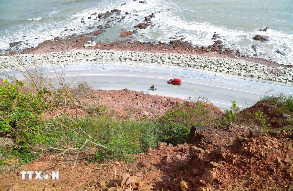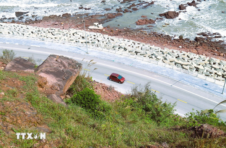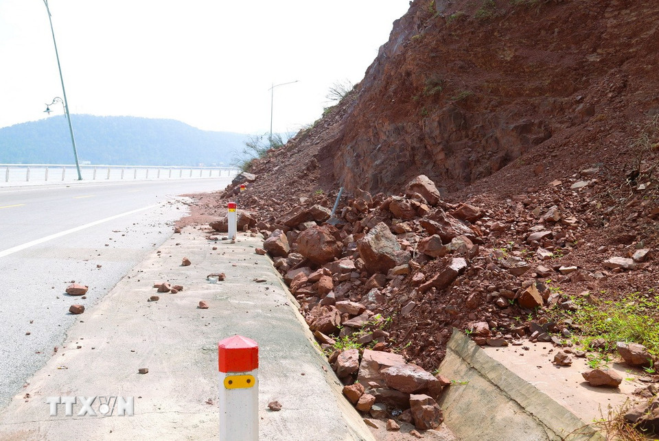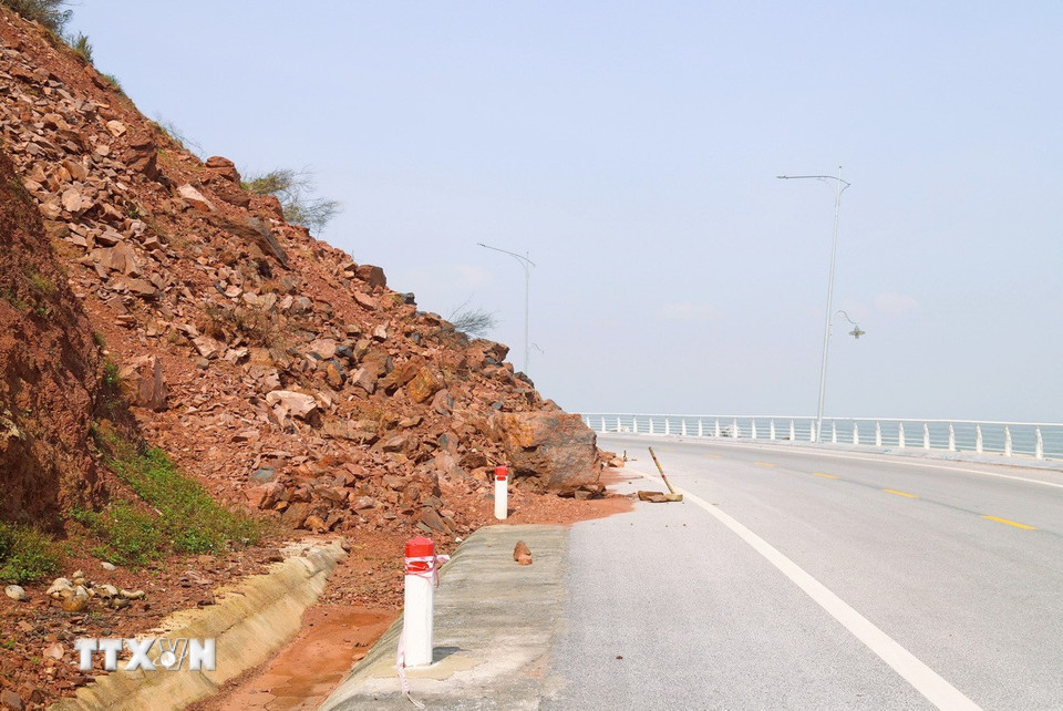 Hiện trường một điểm sạt lở vách núi quy mô lớn xuống đường ven biển vẫn chưa được khắc phục. (Ảnh: Xuân Tiến/TTXVN)