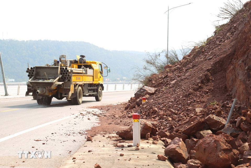 Tại những điểm đã xảy ra sạt lở, các phương tiện qua có nguy cơ bị sạt lở, đá lăn tái diễn. (Ảnh: Xuân Tiến/TTXVN)