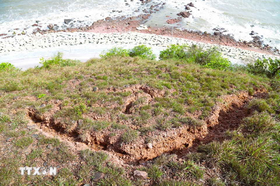Một cung sạt lở, sụt trượt trên núi Mộ Dạ xuất hiện có nguy cơ đổ sập hàng trăm khối đất xuống đường ven biển nếu xảy ra mưa lớn, kéo dài. (Ảnh: Xuân Tiến/TTXVN)