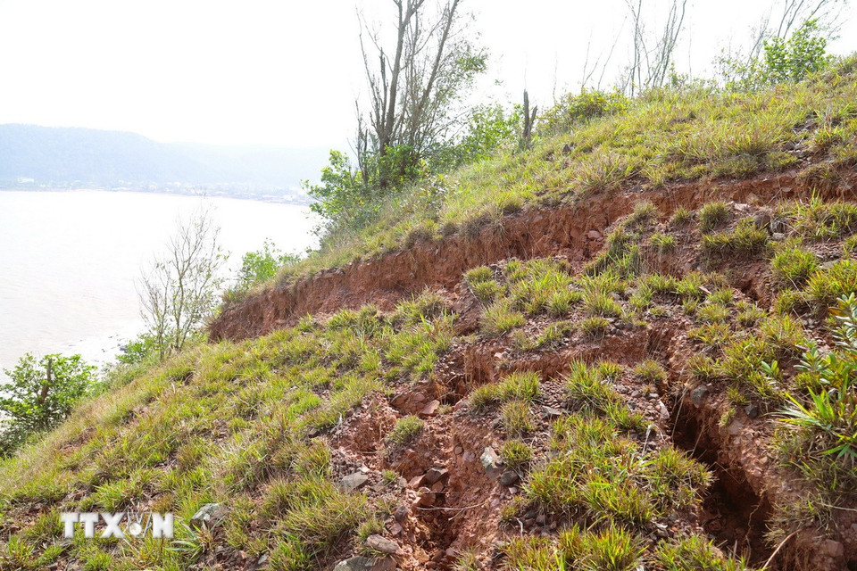 Điểm sạt lở núi Mộ Dạ quy mô lớn nằm ở phía xã Hải Lộc (tỉnh Nghệ An). (Ảnh: Xuân Tiến/TTXVN)