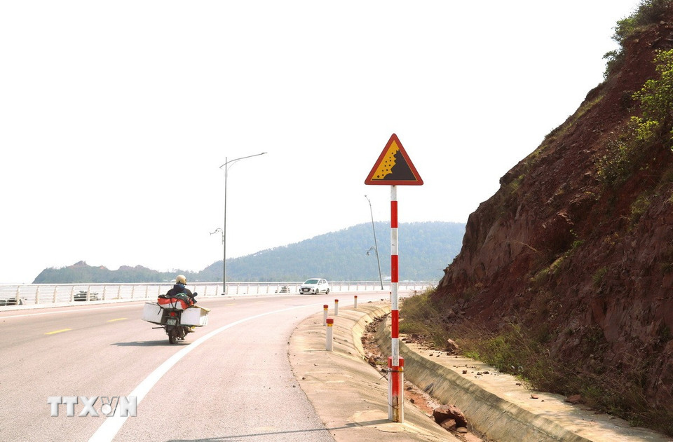 Biển cảnh báo nguy cơ sạt lở đất, đá lăn được cơ quan chức năng cắm trên tuyến đường ven biển Nghi Sơn (Thanh Hóa)-Cửa Lò (Nghệ An) đoạn qua eo biển Cửa Hiền. (Ảnh: Xuân Tiến/TTXVN)