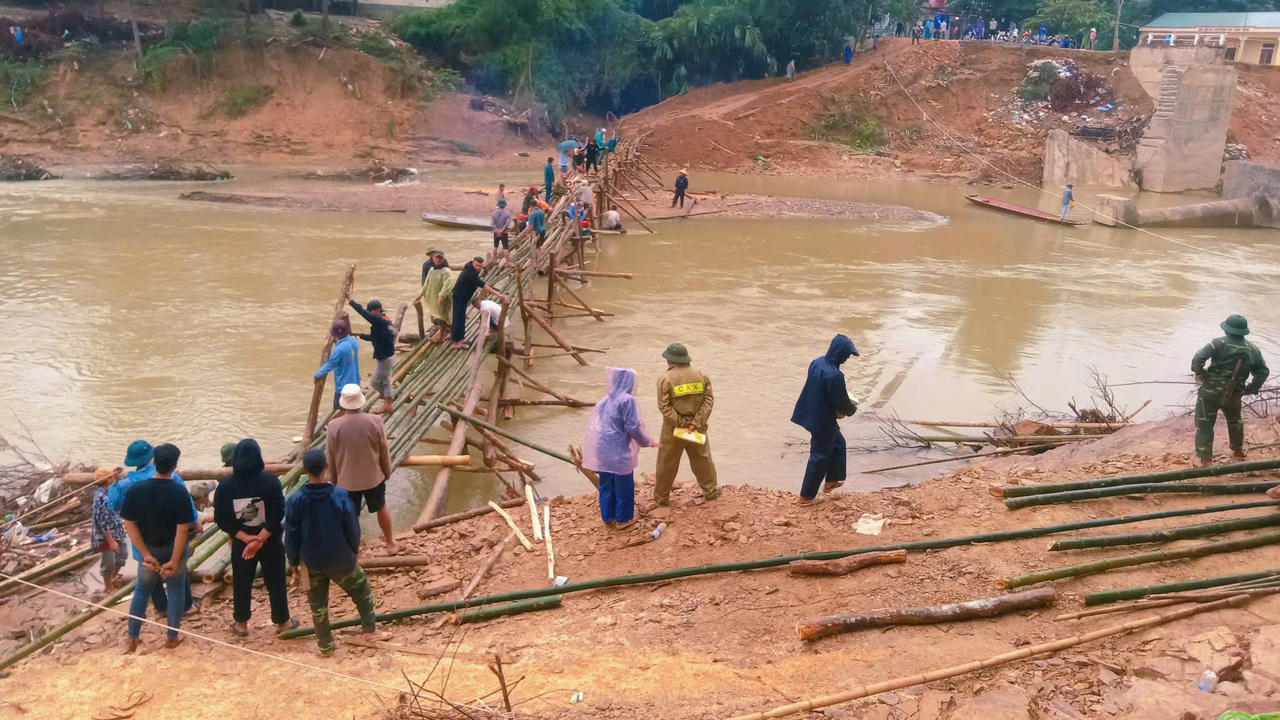 Sau cơn bão số 10, cầu Trung Thắng, xã Yên Hòa bị cuốn trôi, hơn 300 hộ dân với hàng nghìn nhân khẩu rơi vào cảnh bị chia cắt. Chính quyền phải huy động các lực lượng chức năng và người dân làm cầu tre để lưu thông. Ảnh: ĐT
