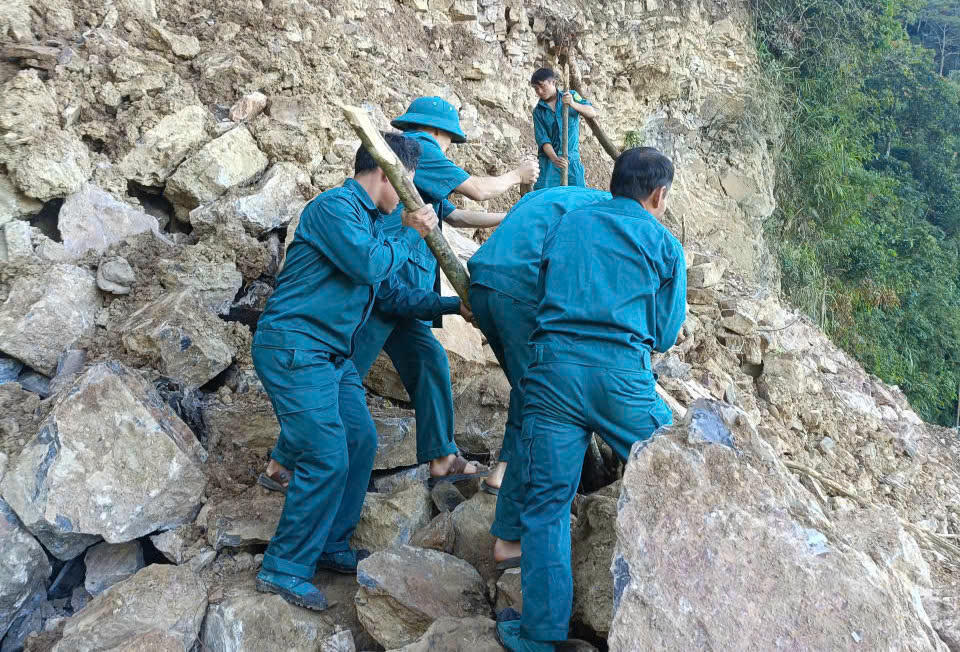 Lực lượng chức năng mở đường vào 6 bản tại xã Mường Lống (Nghệ An). Ảnh: TĐ