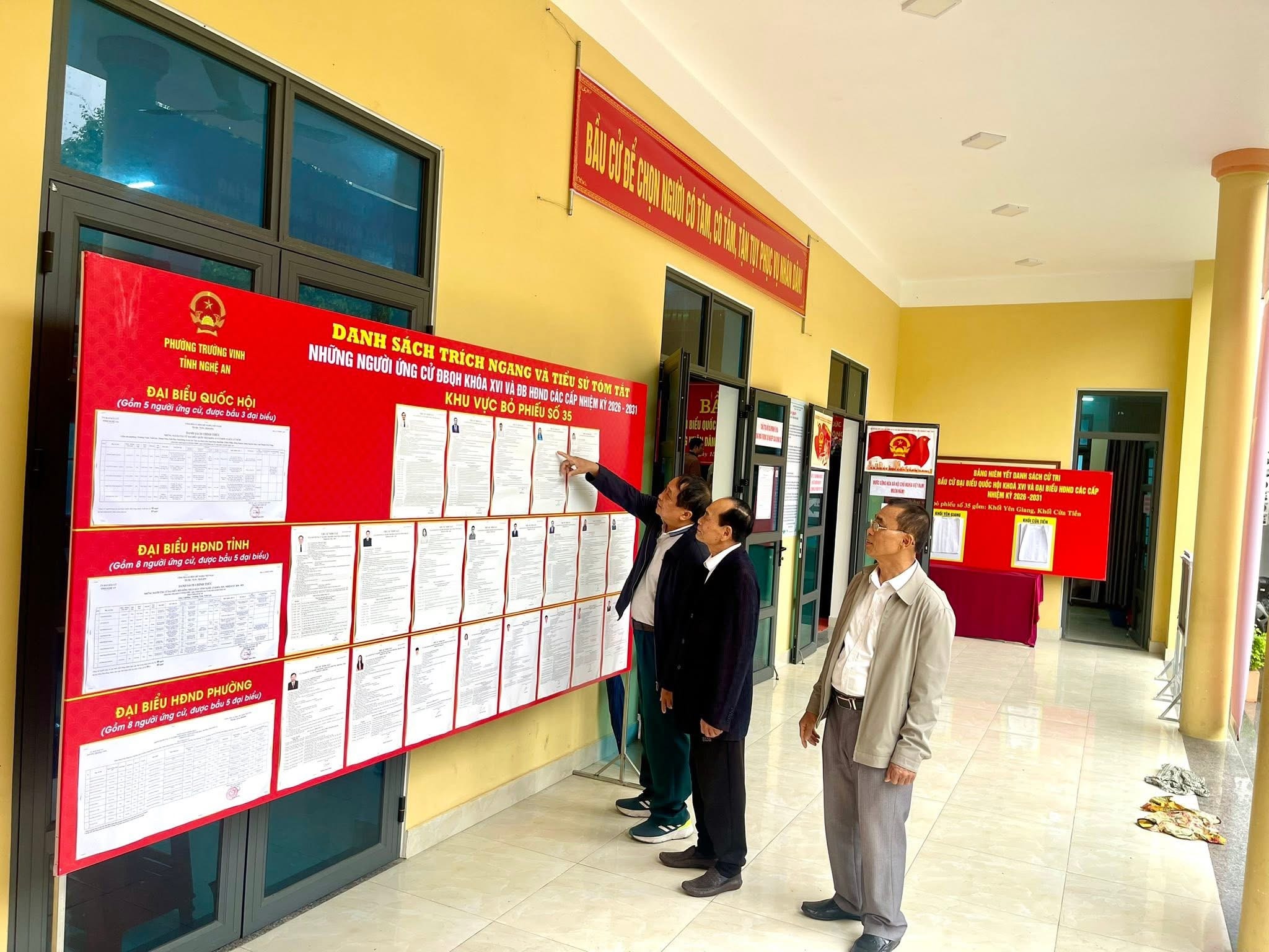Tại các phường, xã như: Cửa Lò, Vinh Lộc, Quan Thành, Tân An, Quế Phong, Sơn Lâm… và nhiều địa phương khác, công tác trang trí khánh tiết được triển khai đồng bộ với cờ Tổ quốc, cờ Đảng, băng rôn, khẩu hiệu tuyên truyền treo dọc các tuyến đường, khu dân cư. Nhiều đoàn xe tuyên truyền lưu động diễu hành qua các tuyến phố, khu dân cư nhằm phổ biến thông tin về cuộc bầu cử, vận động cử tri tích cực tham gia bỏ phiếu.