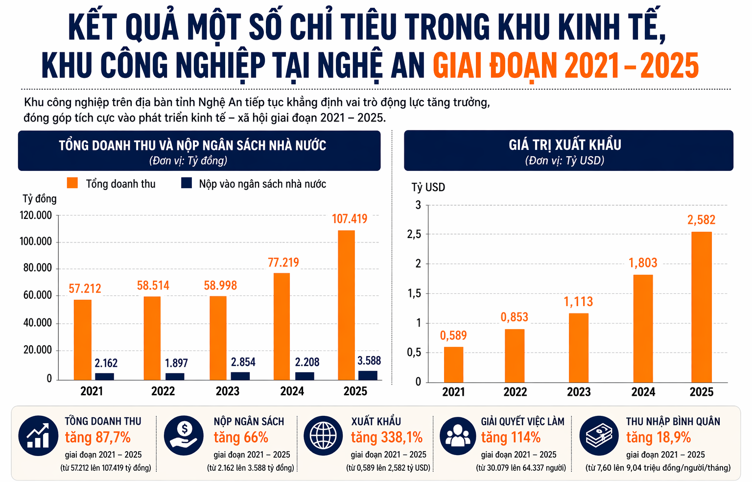 Kết quả về doanh thu, nộp ngân sách, xuất khẩu, giải quyết việc làm, thu nhập người lao động trong KKT Đông Nam, KCN tại Nghệ An. Nguồn số liệu: Ban Quản lý KKT Đông Nam. Đồ họa: Thành Duy