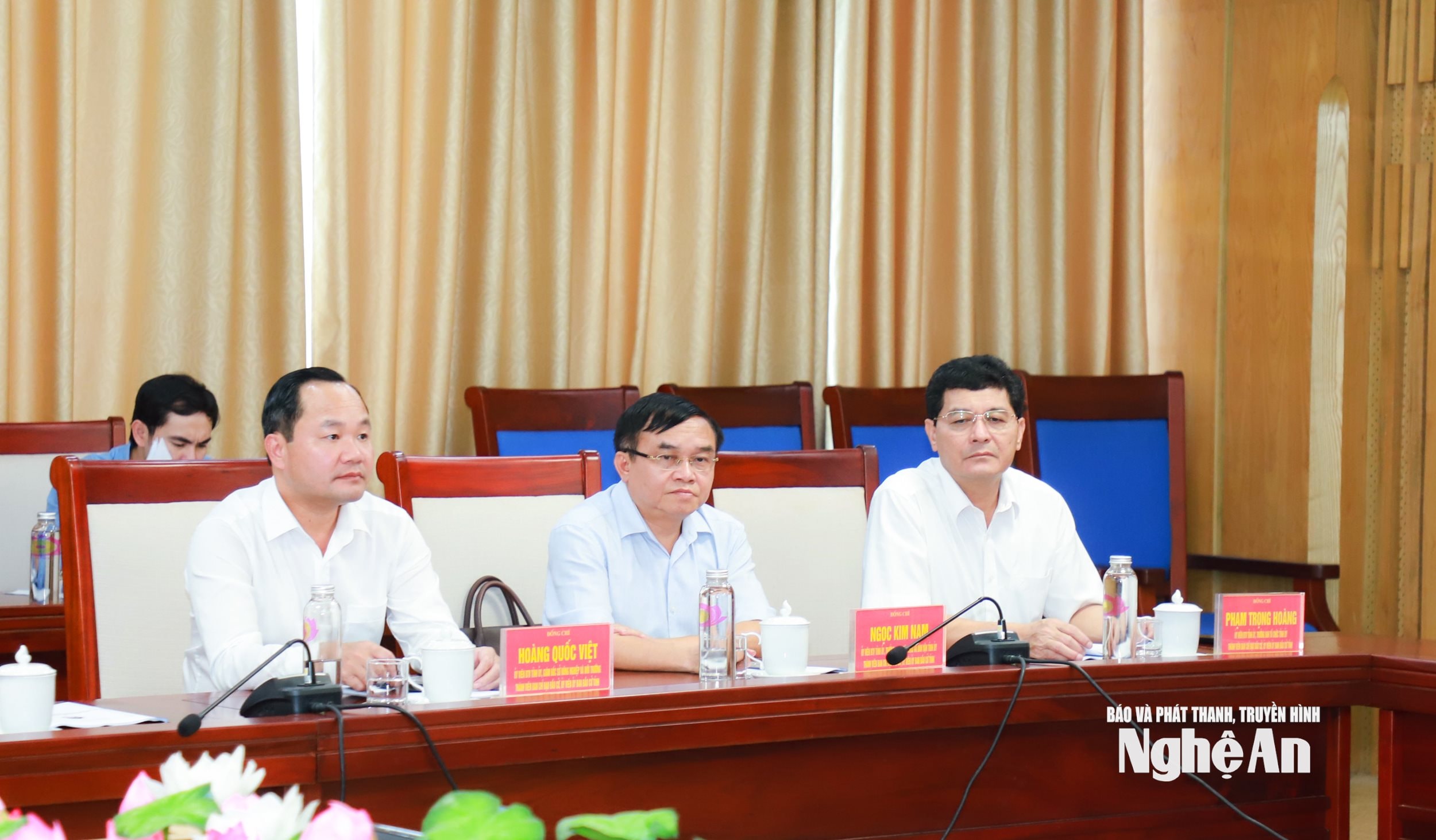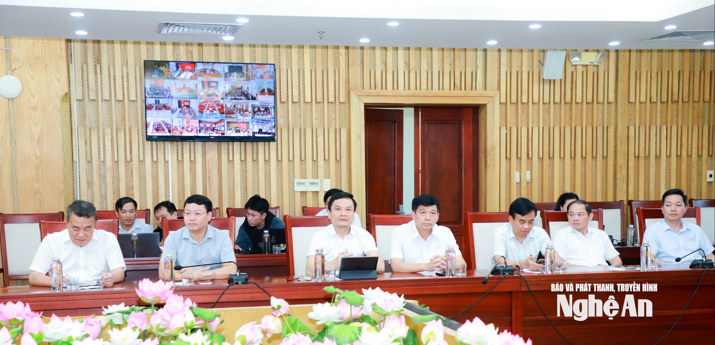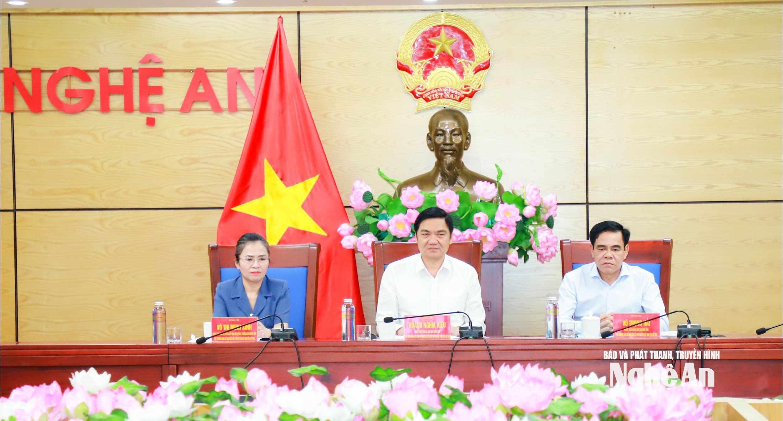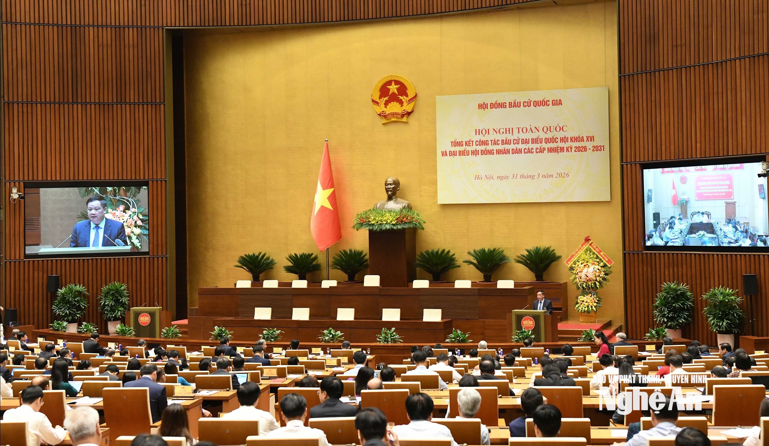 Tại điểm cầu tỉnh Nghệ An, các đồng chí: Hoàng Nghĩa Hiếu - Phó Bí thư Thường trực Tỉnh ủy, Chủ tịch HĐND tỉnh, Phó Trưởng ban Thường trực Ban Chỉ đạo bầu cử tỉnh, Chủ tịch Ủy ban bầu cử tỉnh; Võ Trọng Hải - Phó Bí thư Tỉnh ủy, Chủ tịch UBND tỉnh, Phó Trưởng ban Chỉ đạo bầu cử, Phó Chủ tịch Ủy ban bầu cử tỉnh; Võ Thị Minh Sinh - Phó Bí thư Tỉnh ủy, Chủ tịch Ủy ban MTTQ tỉnh, Trưởng Đoàn ĐBQH tỉnh Nghệ An khóa XV; Phó Trưởng ban Chỉ đạo bầu cử, Phó Chủ tịch Ủy ban bầu cử tỉnh đồng chủ trì.