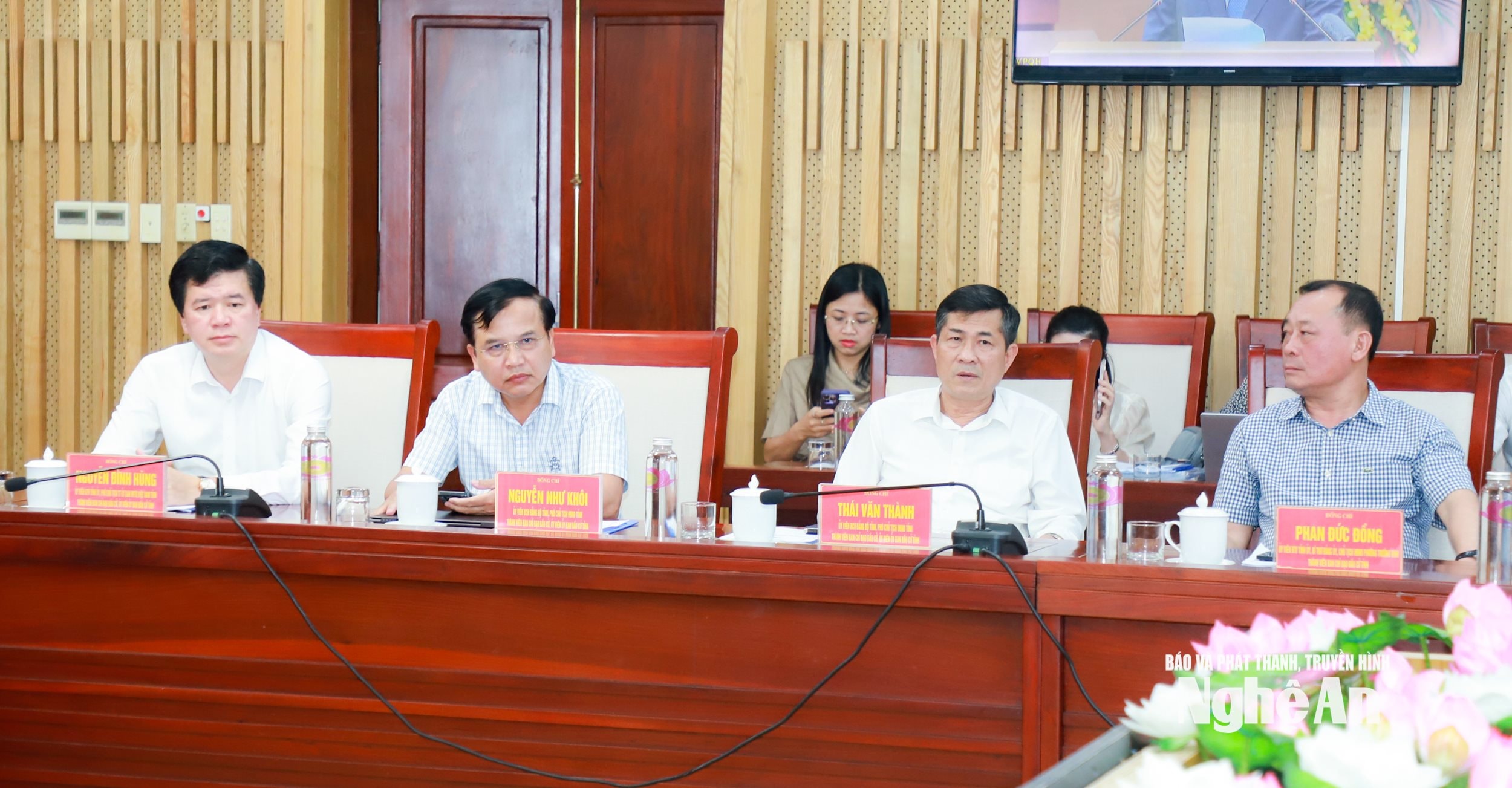 Các đồng chí trong Thường trực Tỉnh ủy chủ trì tại điểm cầu tỉnh Nghệ An. Ảnh: Thành Duy