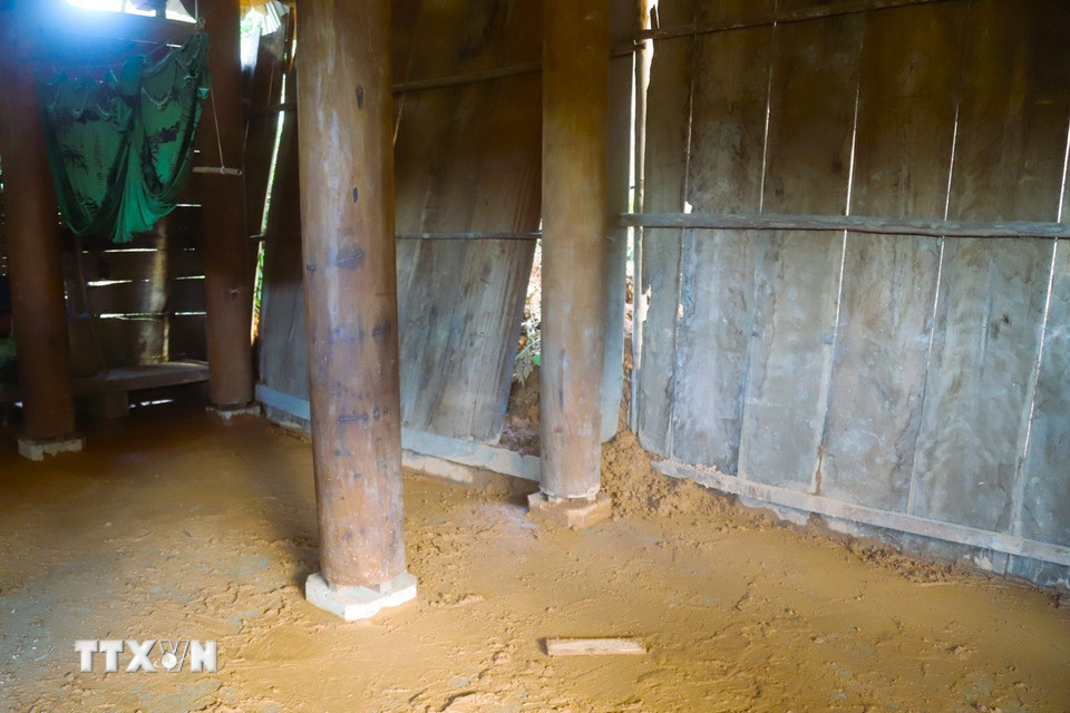 Sạt lở vách taluy dương sau nhà khiến một lượng lớn bùn, đất tràn vào nhà dân, gây hư hỏng các bức tường bằng ván gỗ xung sau nhà. (Ảnh: Xuân Tiến/TTXVN)