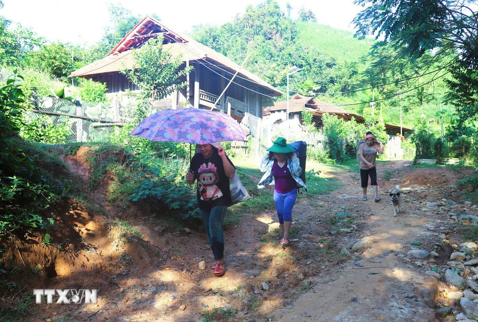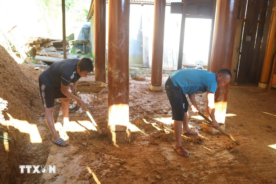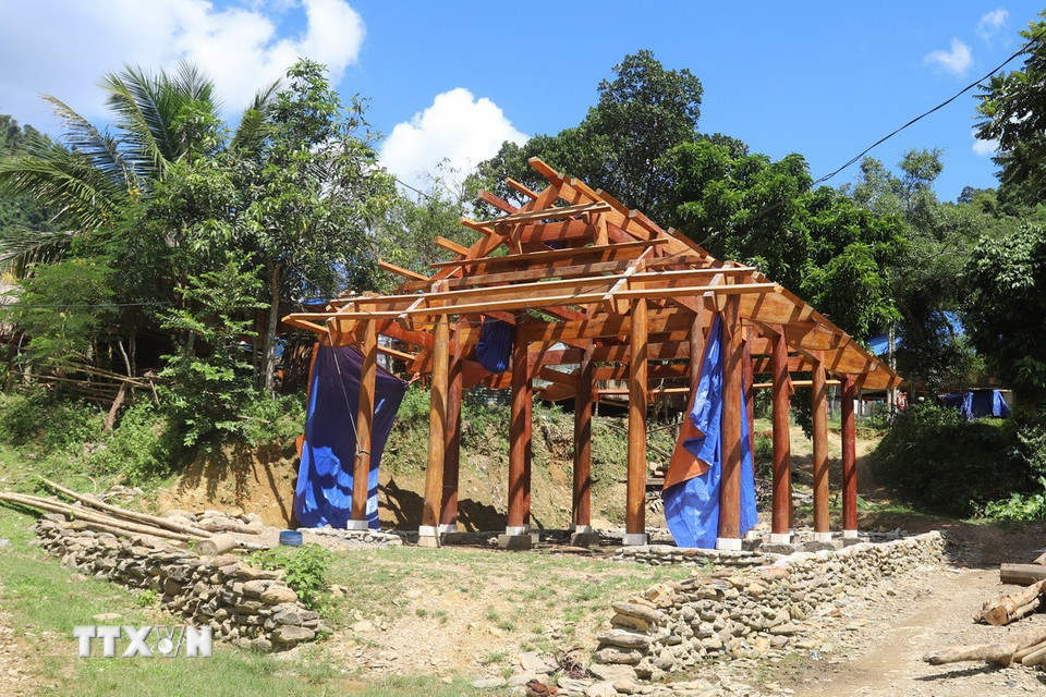 Nhiều ngôi nhà thuộc Chương trình xóa nhà tạm, nhà dột nát trong bản vẫn chưa thể lợp mái do đường giao thông bị hỏng từ đợt bão số 5, xe chở vật liệu không thể vào bản. (Ảnh: Xuân Tiến/TTXVN)