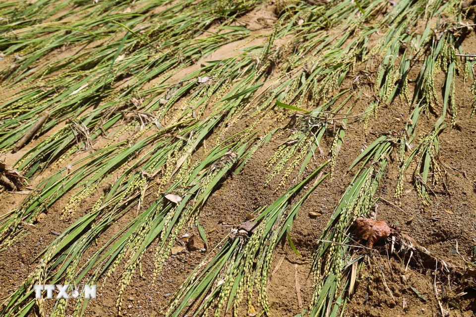 Lúa đang độ thu hoạch bị ngã rạp, vùi lấp dưới đất khi lũ ống, lũ quét càn qua. (Ảnh: Xuân Tiến/TTXVN)