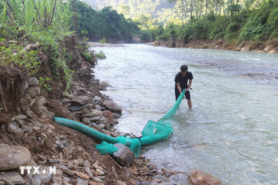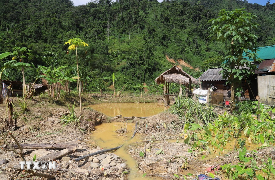 Ao nuôi cá của người dân bị lũ ống, lũ quét càn qua gây vỡ bờ bao, mất sạch cá nuôi trong ao. (Ảnh: Xuân Tiến/TTXVN)