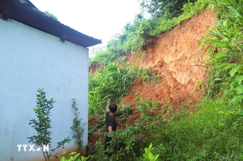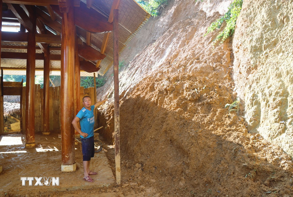 Nhà anh Kha Văn Luận ngay cửa ngõ của bản Na Ngân đã bị sạt lở vách taluy dương phía sau nhà. (Ảnh: Xuân Tiến/TTXVN)