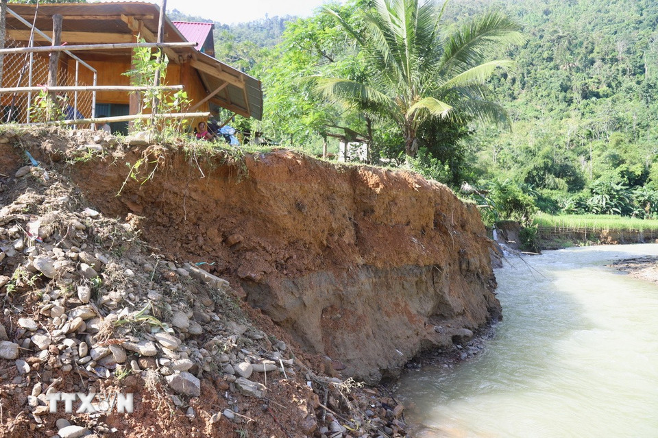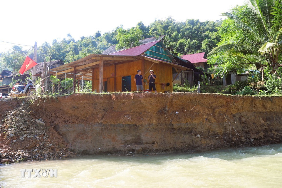 Lũ ống, lũ quét với dòng chảy xiết đã gây xói mòn, xâm thực vào gần nhà dân. (Ảnh: Xuân Tiến/TTXVN)