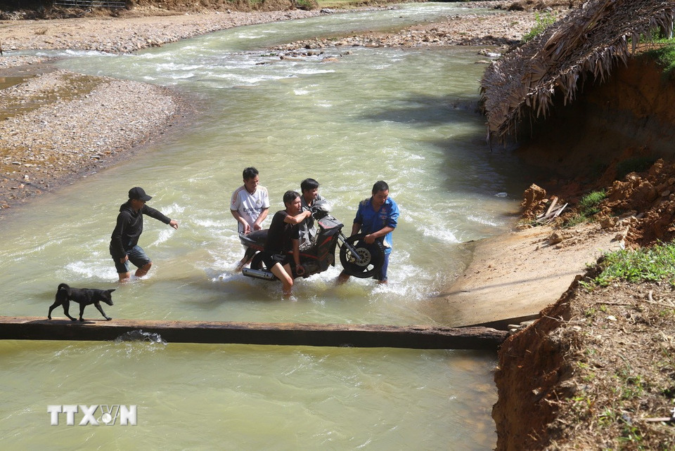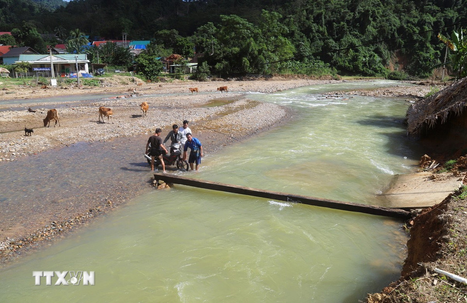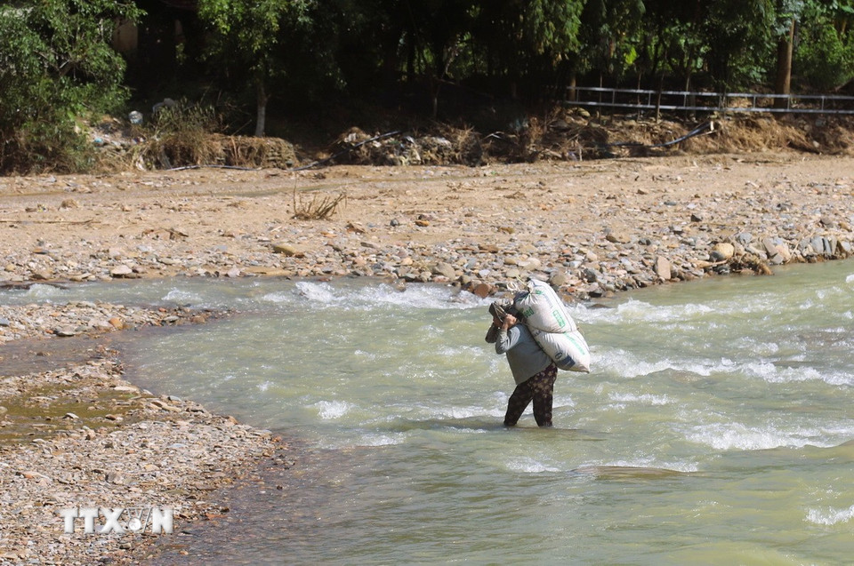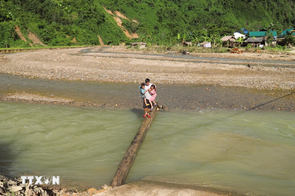 Người lớn bế trẻ nhỏ đi trên thanh gỗ lớn được bắc qua suối Nậm Ngân tại vị trí cầu gỗ đã bị lũ cuốn trôi. (Ảnh: Xuân Tiến/TTXVN)