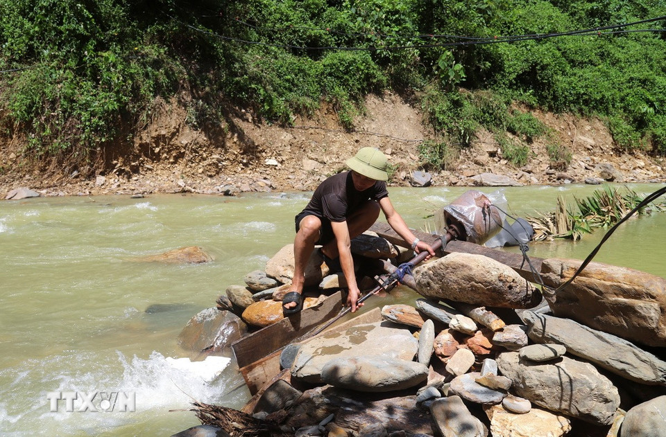 Cả bản bị mất điện từ nhiều ngày qua nên nhiều hộ dân phải sử dụng máy phát điện bằng sức nước để có nguồn điện thắp sáng. (Ảnh: Xuân Tiến/TTXVN)