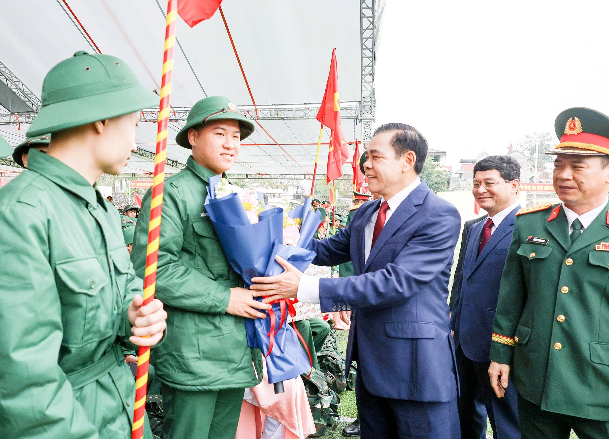 Chủ tịch UBND tỉnh Nghệ An Võ Trọng Hải trực tiếp đến từng hàng quân, ân cần thăm hỏi và tặng hoa chúc mừng các tân binh lên đường nhập ngũ