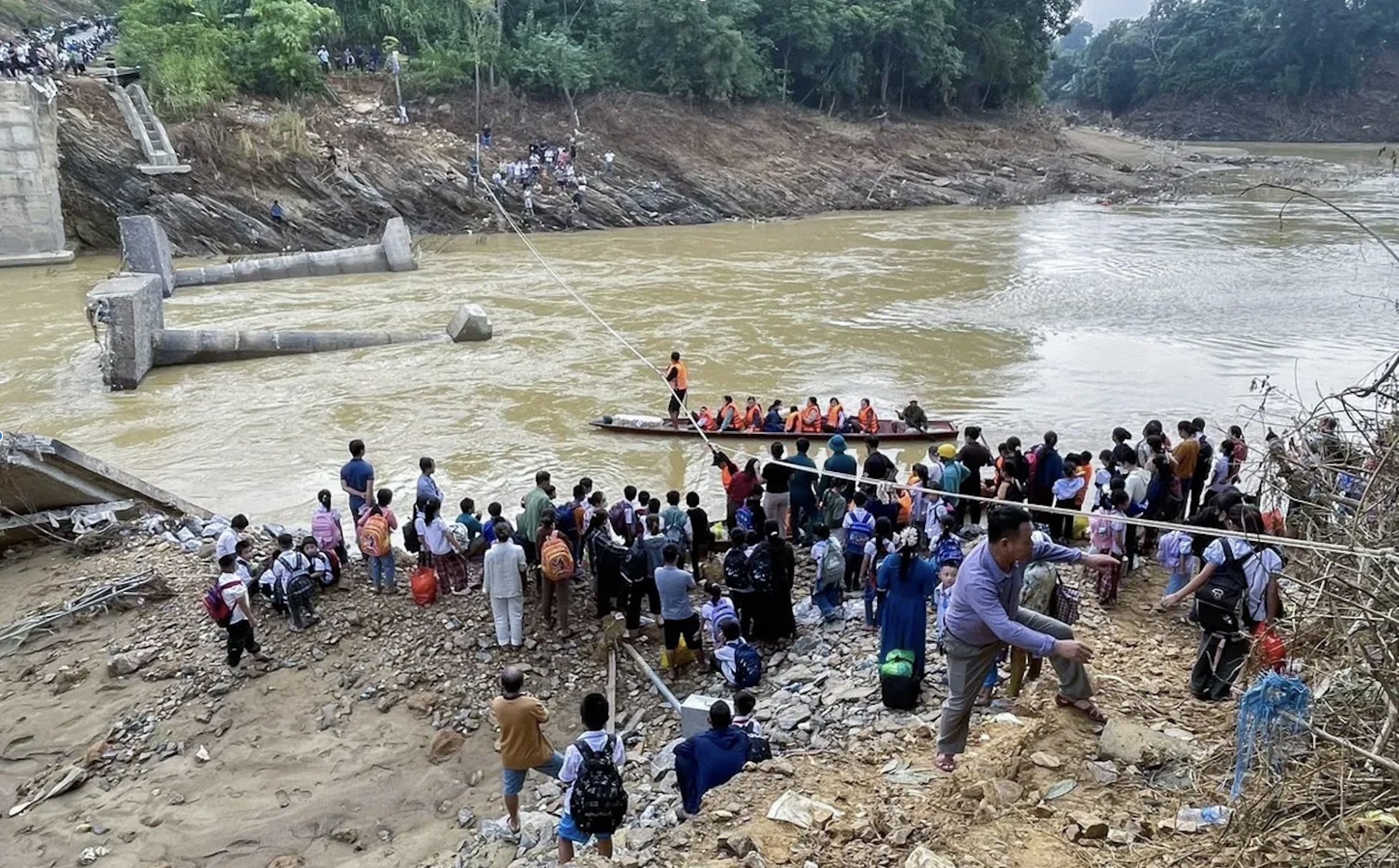Cây cầu bê tông cốt thép bắc qua sông Hội Nguyên (xã Yên Hòa) bị lũ cuốn đổ sập vào ngày 29/9. Người dân sau đó phải dùng thuyền và dây kéo để qua sông.