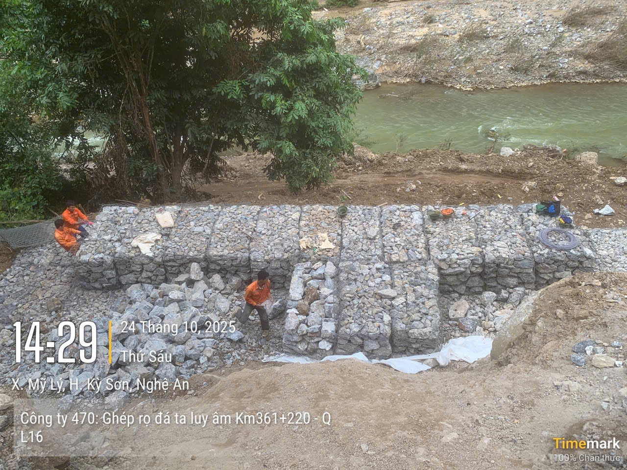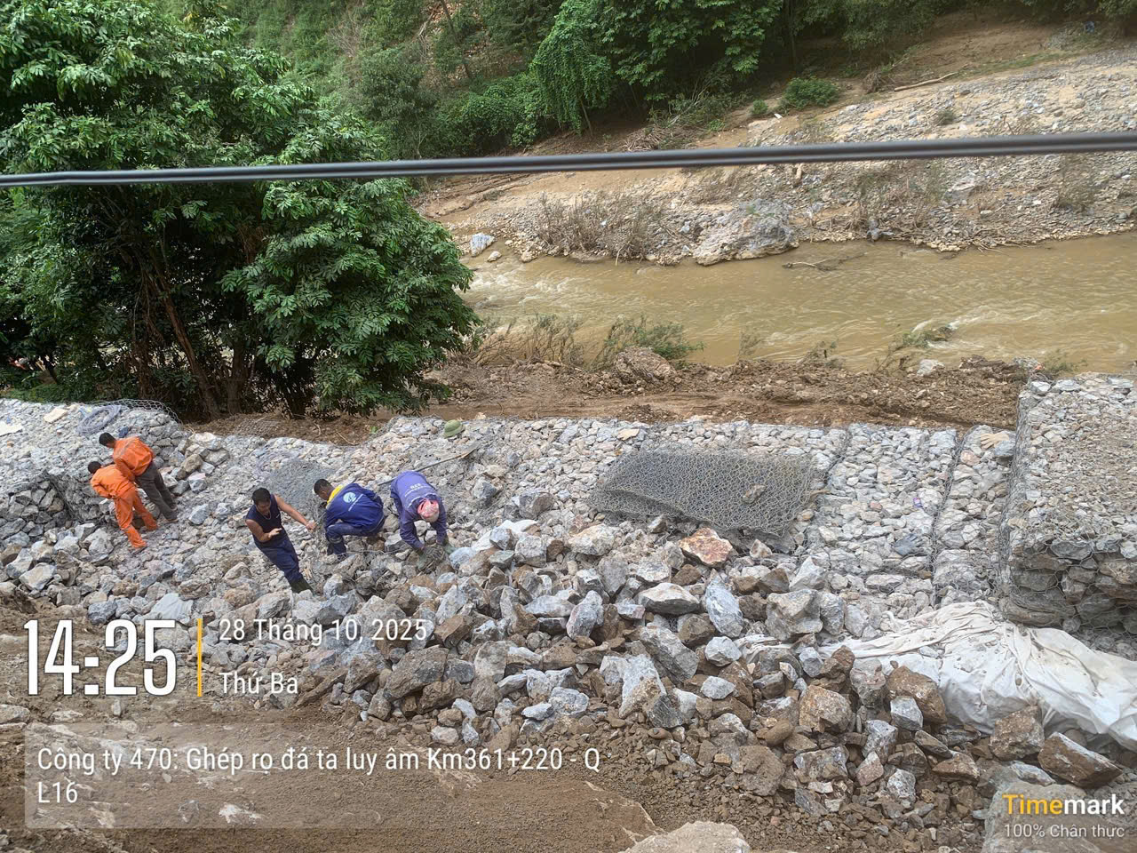 Những vị trí bị nước lũ cuốn trôi mất toàn bộ đường được gia cố bằng rọ đá trước khi khôi phục.