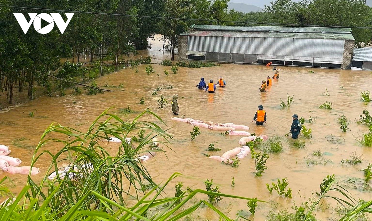 Tại xã Nghĩa Đàn, tỉnh Nghệ An, đàn lợn 270 con, ước tính tổng giá trị khoảng 1,5 tỷ đồng đã bị ngập trong nước. Trước tình hình khẩn cấp, lực lượng Công an xã và Quân sự xã đã nhanh chóng huy động cán bộ, chiến sĩ cùng phương tiện, phối hợp với người dân di dời đàn lợn của gia đình ông Lê Duy Chung.
