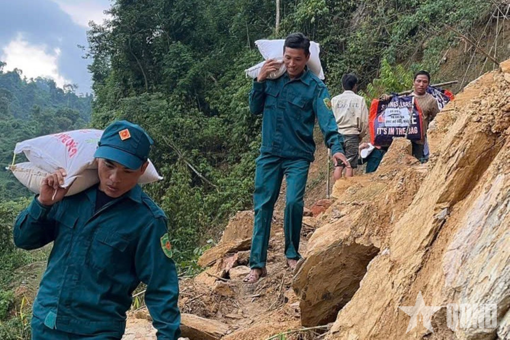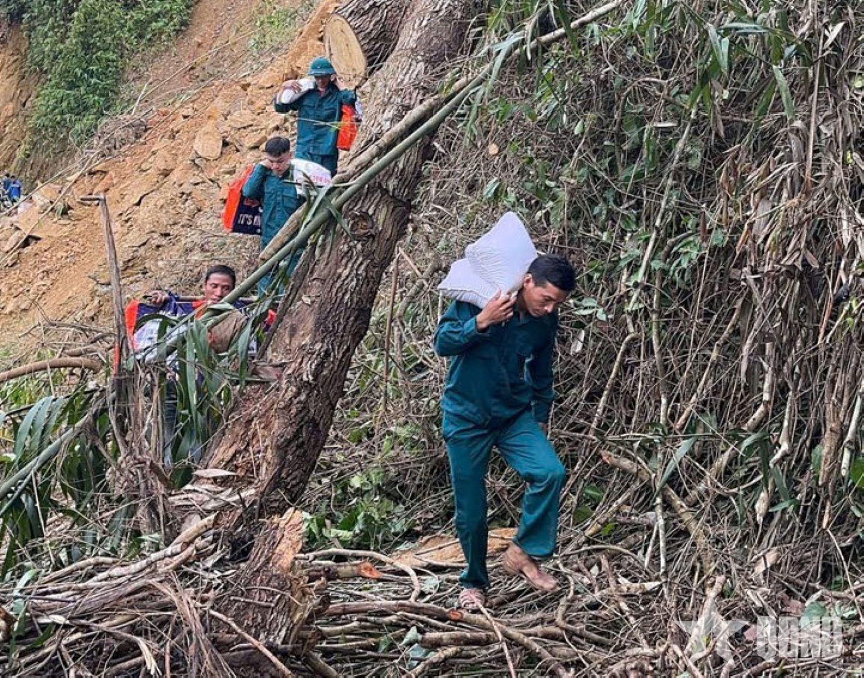 Khi gặp điểm sạt lở, các lực lượng bắt đầu vác gạo, thực phẩm đi bộ.