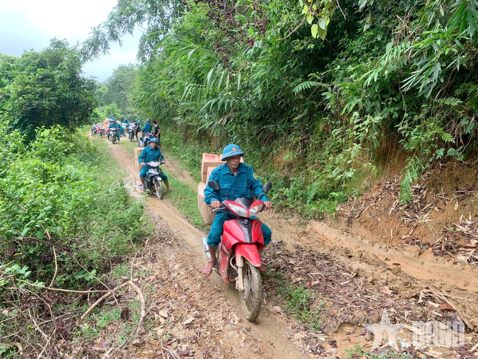 Để thực hiện được nhiệm vụ trên, các lực lượng đã chất hàng hóa, nhu yếu phẩm lên xe tải, xe máy vận chuyển vào sâu nhất có thể. Khi đến đoạn đường bị sạt lở, các phương tiện không thể di chuyển được nữa, dân quân và người dân sẽ đi bộ vác qua. Trong đó, có những điểm sạt lở rất nguy hiểm, buộc mọi người phải rất cẩn thận, mất nhiều thời gian mới vượt qua được. Cùng thời điểm, người dân bản Na Ngân cũng đi xe máy ngược ra phái trung tâm xã để đón, chuyển nhu yếu phẩm cần thiết về phục vụ cuộc sống.