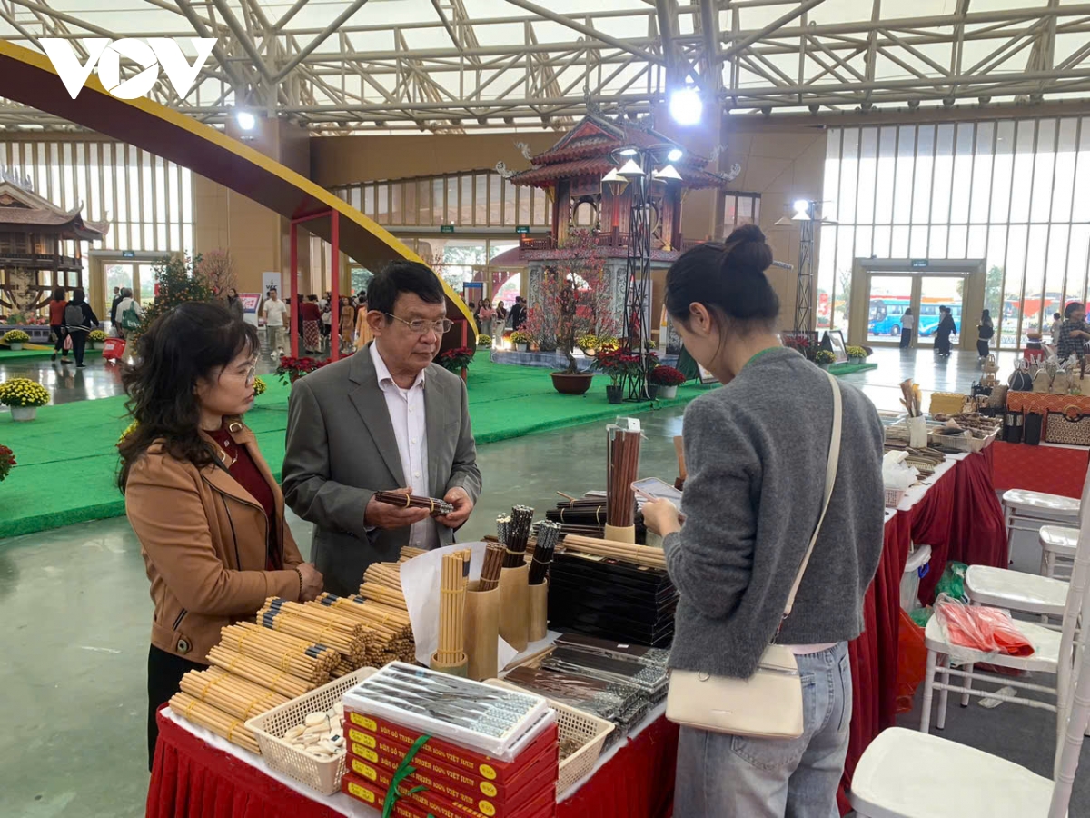 Nhiều du khách nán lại xem các sản phẩm từ làng nghề sừng Thụy Ứng tại Hội chợ Mùa Xuân