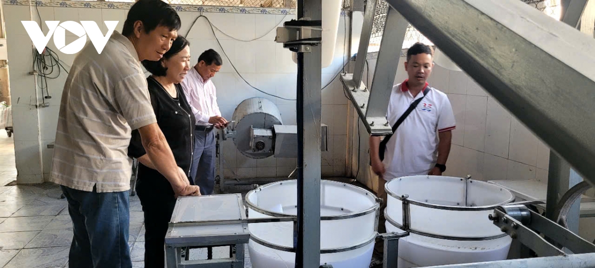 Một cơ sở sản xuất bánh phồng "bán công nghiệp" tại xã Cái Bè được đầu tư trang thiết bị, máy móc khá hiện đại
