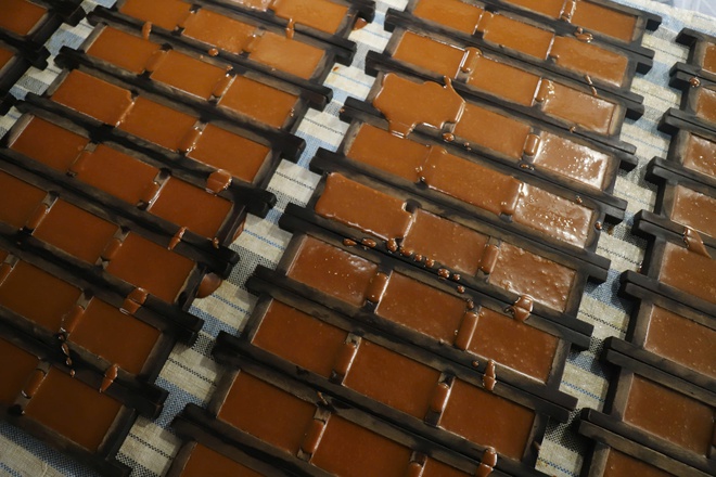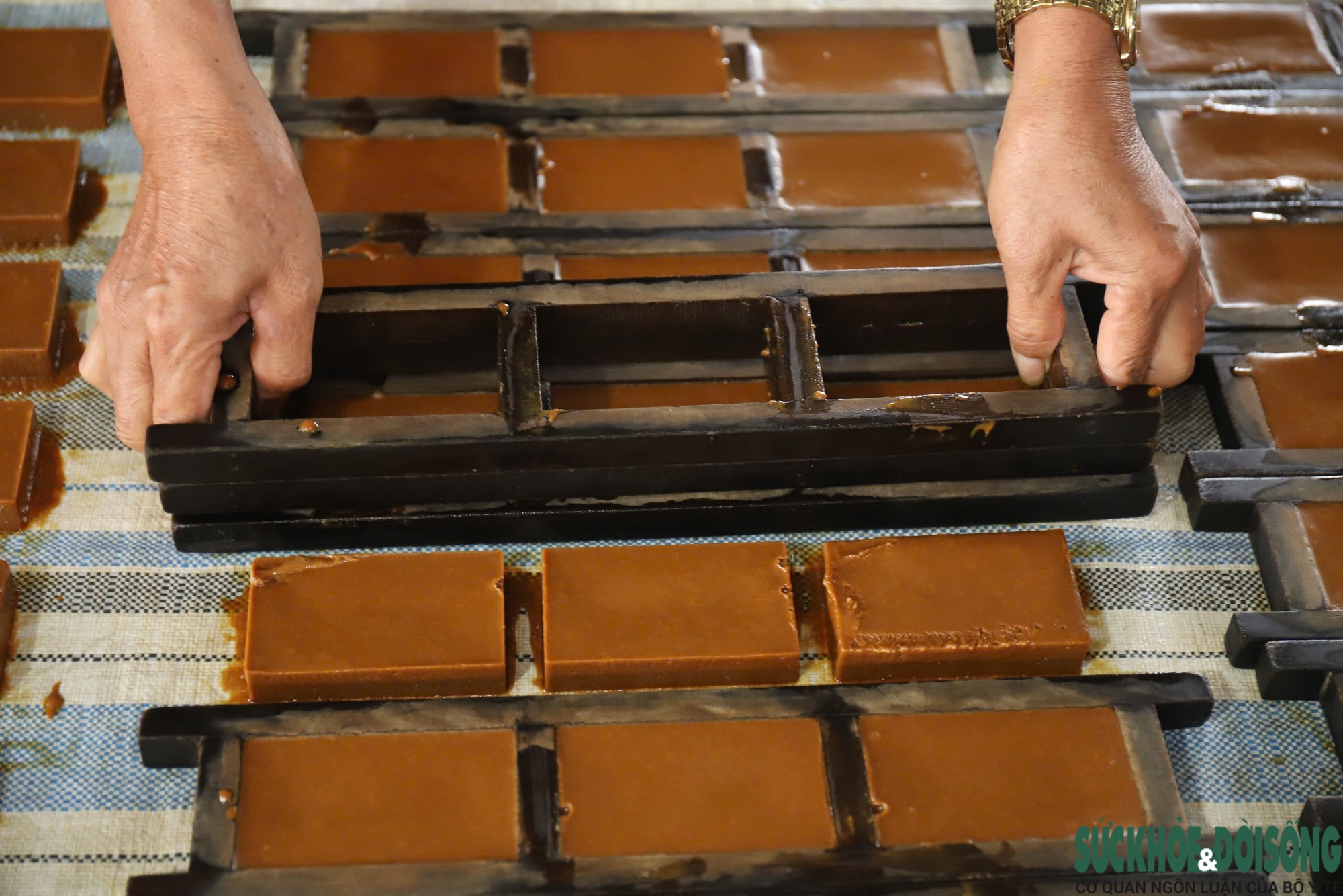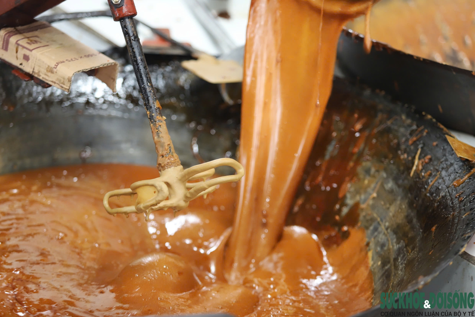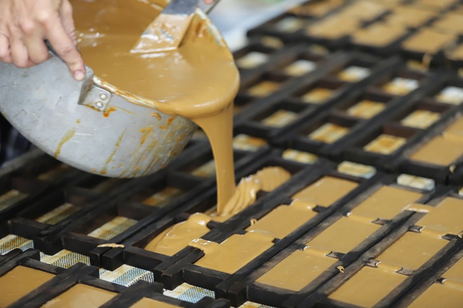 Mật mía được nấu liên tục trong khoảng một giờ, vợ chồng anh Yên thay nhau khuấy đều để tránh cháy, đảm bảo chất lượng thành phẩm. Sau khi đạt độ chín, mật được đưa sang chảo có gắn động cơ để đánh tan trong 10 - 15 phút trước khi đổ khuôn.
