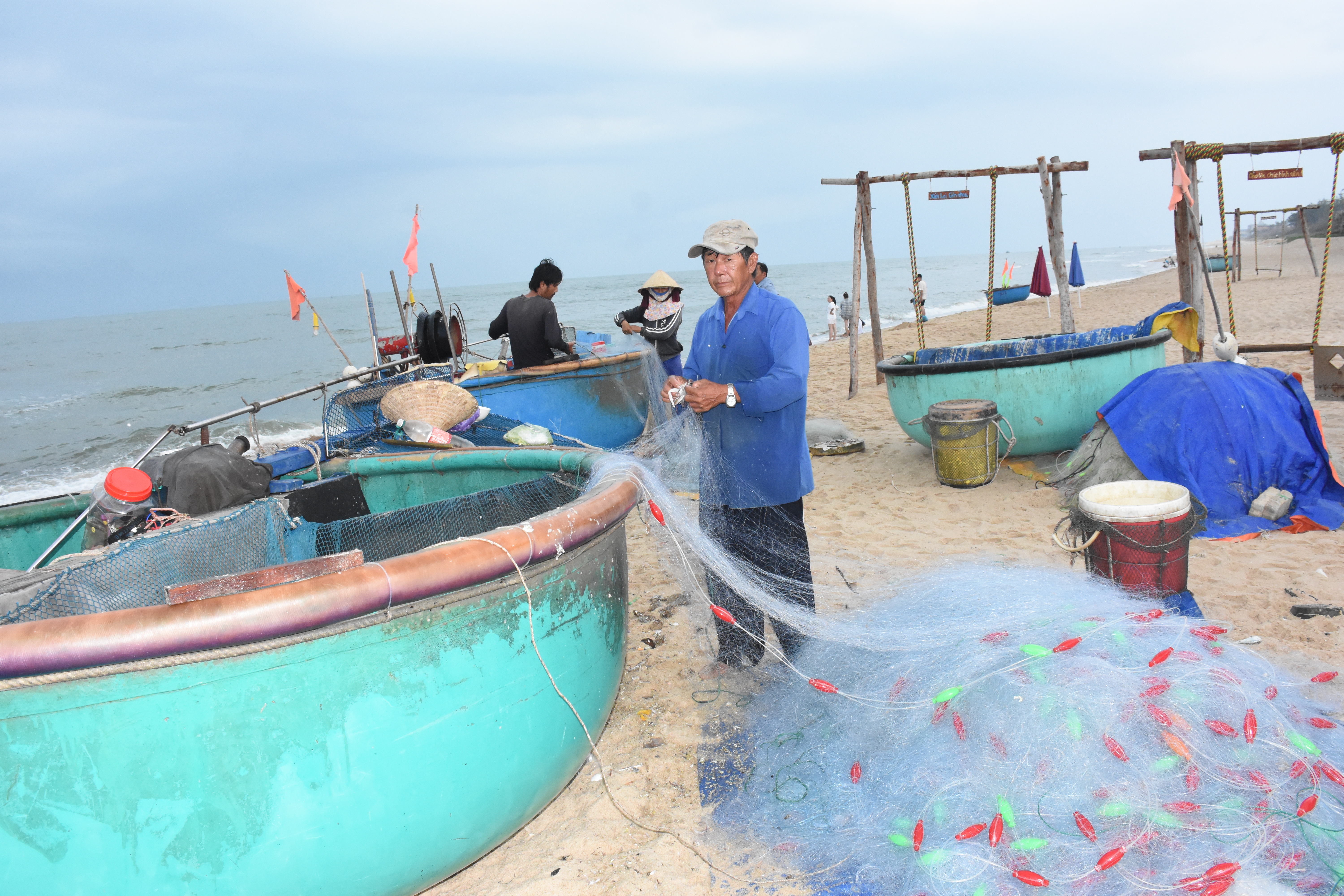 Sáng sớm, bãi biển Phước Hải sóng ì oạp vỗ bờ. Những con thuyền thúng giơ tấm lưng tròn, nằm im trên bãi cát. Đúng 4 giờ, lật thúng lên, chuẩn bị ngư lưới cụ, lão ngư Lê Hữu Đức đẩy chiếc thuyền ra khơi.
