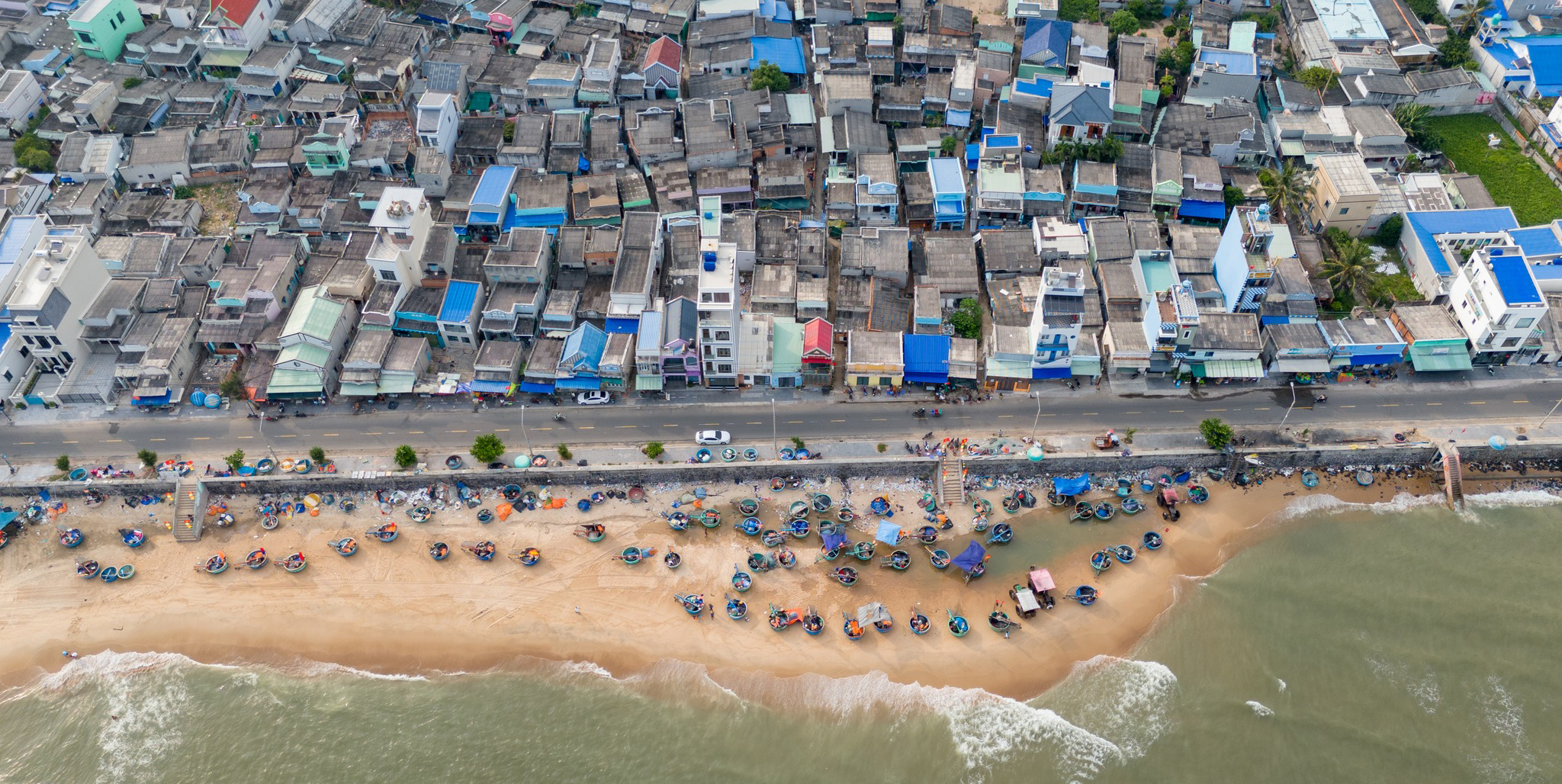 Làng chài Phước Hải nhìn từ trên cao như một bức tranh được điểm xuyết bởi những chấm tròn là những chiếc thuyền thúng. Ảnh: Đ.C.X