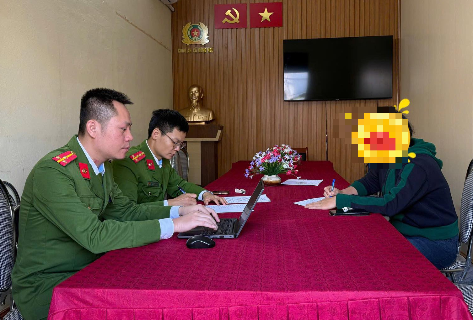 Chủ tài khoản Febook làm việc với Công an xã Đông Ngũ. Ảnh: Cơ quan Công an.