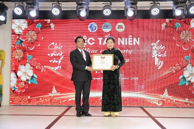 TS. Lê Ngọc Dũng – Ủy viên Ủy ban Trung ương Mặt trận Tổ quốc Việt Nam – Chủ tịch Hội Nghệ nhân và Thương hiệu Việt Nam trao danh hiệu Nghệ nhân Quốc gia cho bà Phạm Thị Hòa tại Hà Nội