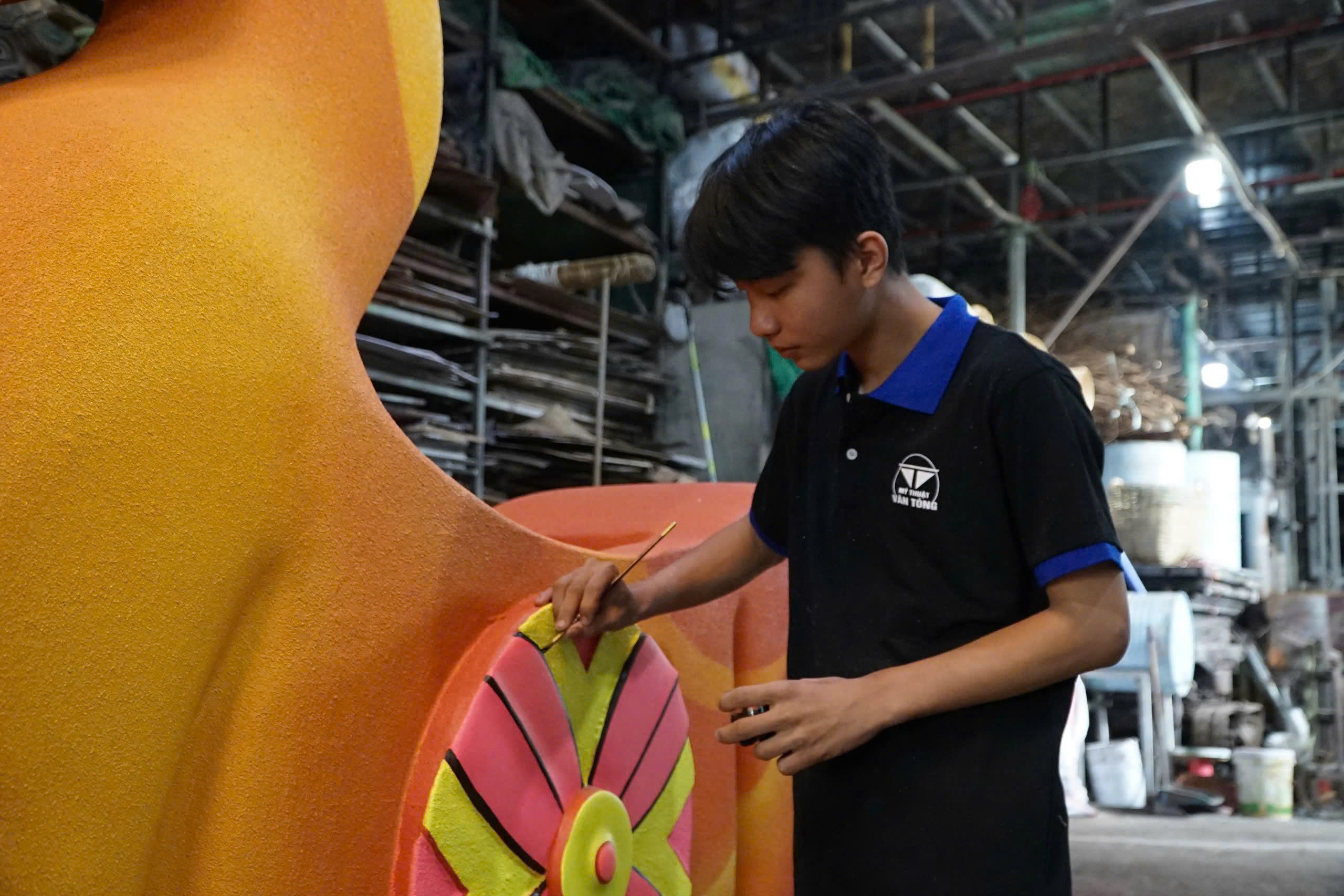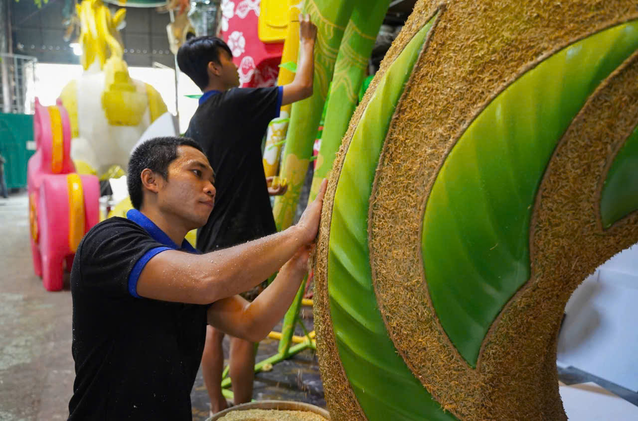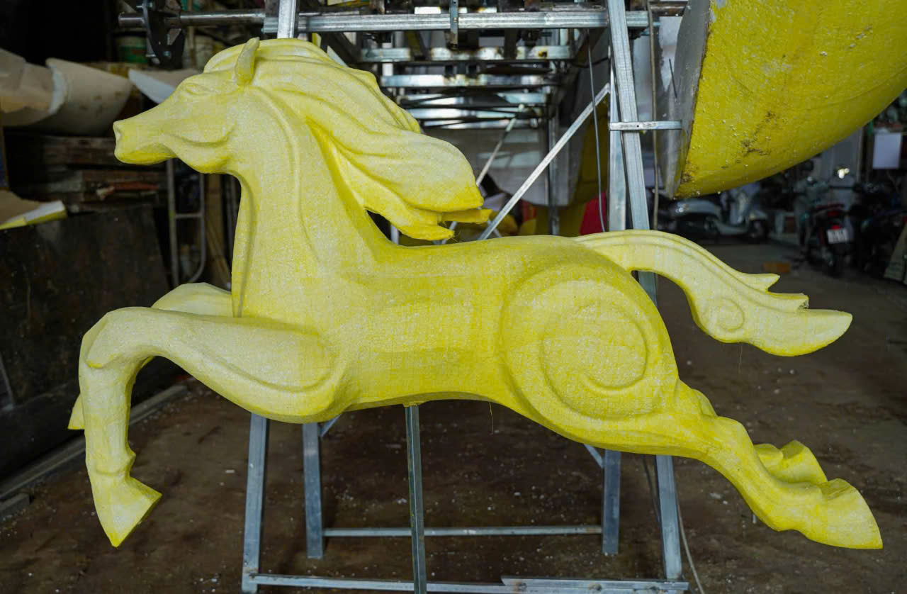 Song song đó, tại một xưởng chế tác khác, đại cảnh cuối mang tên “Giang sơn cẩm tú” cũng đang được gấp rút hoàn thiện. Hạng mục này do ông Đỗ Thái Bình (phường Hiệp Bình, TPHCM) và cộng sự phụ trách, gồm 9 linh vật ngựa vĩnh cửu trong tư thế phi nước đại.