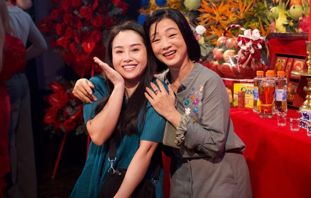 Nghệ sĩ Phi Nga và NSƯT Mỹ Duyên chụp ảnh lưu niệm. Không chỉ là ngày cúng Tổ, đây là dịp hiếm hoi để các nghệ sĩ gặp gỡ, chia sẻ công việc, cuộc sống.