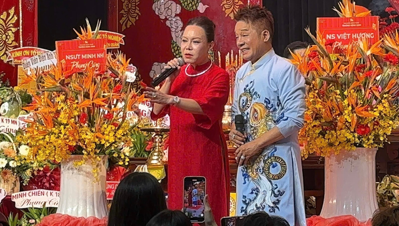 Việt Hương phát biểu cô luôn nhớ ơn thầy Minh Nhí - người dìu dắt cô từ lúc còn là sinh Trường Nghệ thuật Sân khấu 2 (nay là Đại học Sân khấu Điện ảnh TPHCM). "Hôm nay ngày giỗ Tổ tri ân người giữ ngành nghề, được đứng cạnh thầy Minh là tri ân lớn nhất và là điều hạnh phúc nhất. Cảm ơn khán giả luôn yêu thương. Cảm ơn các thầy cô giáo đến giỗ Tổ cùng sân khấu", Việt Hương chia sẻ.