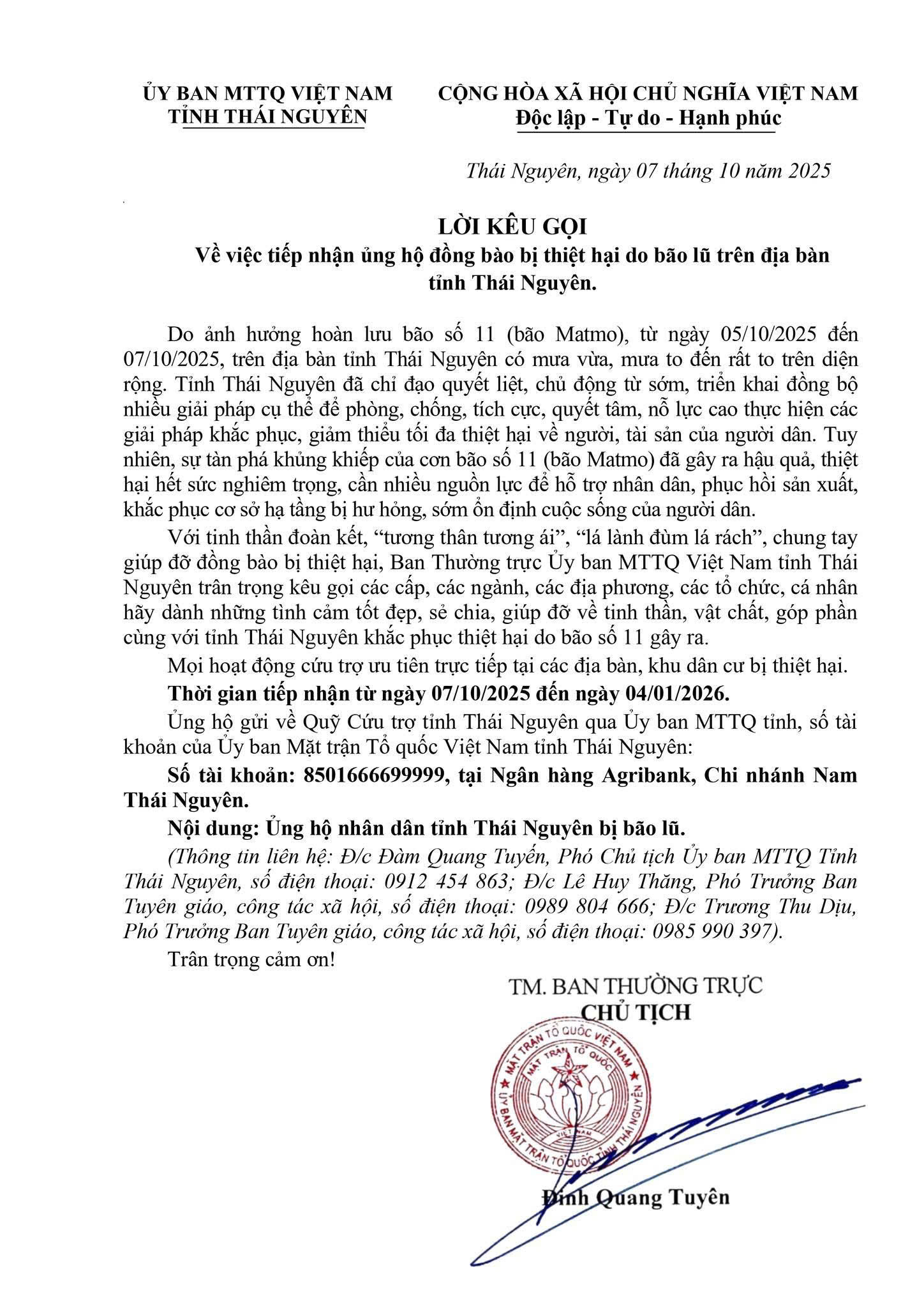 Sau những thiệt hại nặng nề do cơn bão số 11 (Matmo) gây ra, người dân tỉnh Thái Nguyên đang gồng mình khắc phục hậu quả. Trước tình hình đó, Ban Thường trực Ủy ban Mặt trận Tổ quốc (MTTQ) Việt Nam tỉnh Thái Nguyên có văn bản gửi các địa phương, tổ chức, cá nhân về việc tiếp nhận ủng hộ đồng bào bị thiệt hại do bão lũ trên địa bàn tỉnh Thái Nguyên. Trong thời điểm cấp bách này, tinh thần "lá lành đùm lá rách" một lần nữa lan tỏa mạnh mẽ trong cộng đồng.