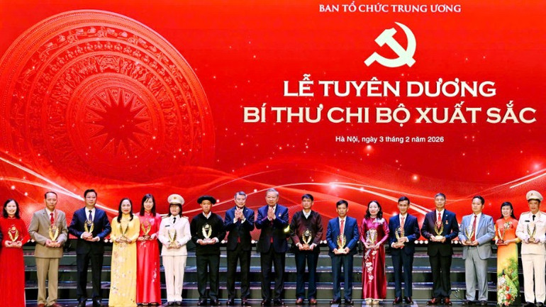 Nghệ sĩ Nhân dân Trịnh Thúy Mùi (thứ tư từ trái sang) tại Lễ tuyên dương Bí thư Chi bộ xuất sắc trong toàn Đảng năm 2026. (Ảnh: THỦY NGUYÊN)