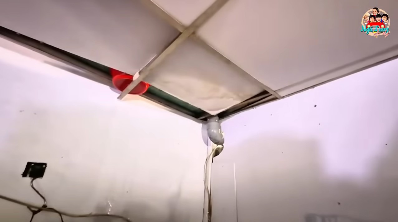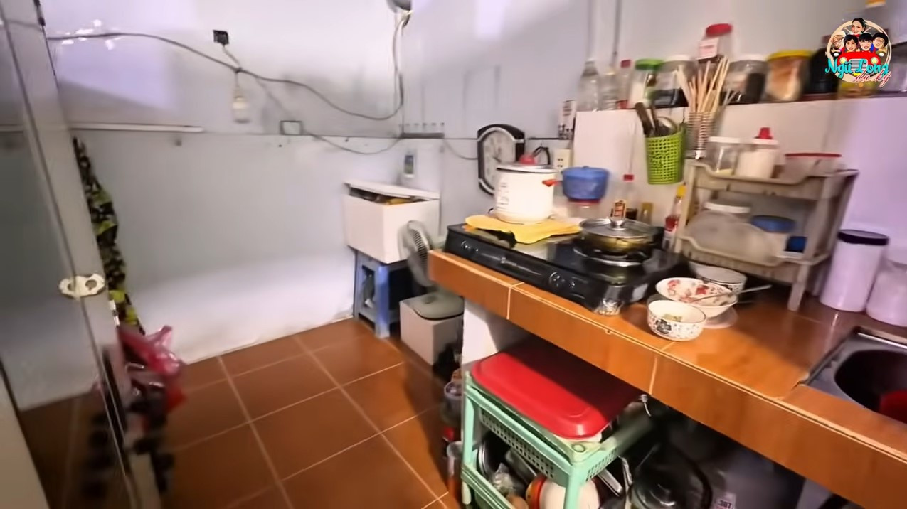 Không gian sống chật hẹp của nghệ sĩ Phụng Nghi, nơi đồ ve chai chất đầy trong nhà, mái tôn mục nát để chậu hứng nước giột khi trời mưa. Con gái bà ngủ trong gian bếp.