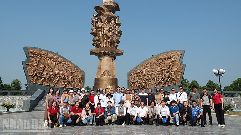 Đoàn chụp ảnh lưu niệm tại tượng đài trung tâm khu tưởng niệm Chiến khu Đ.