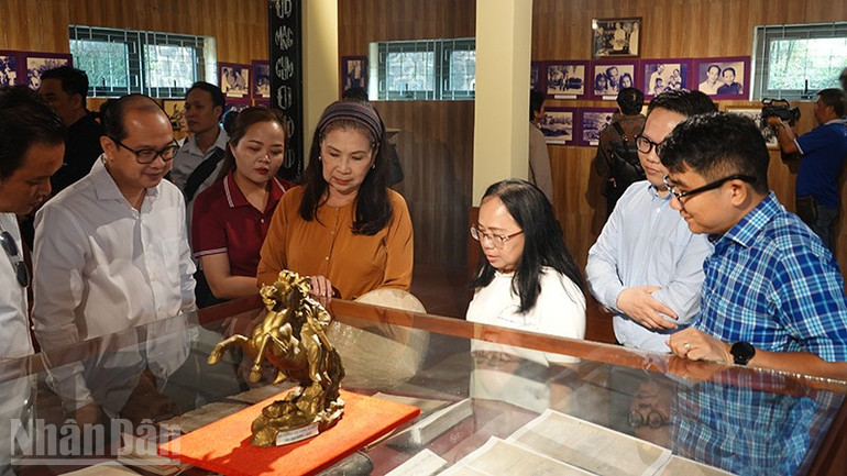 Đoàn tham quan phòng trưng bày tại Nhà lưu niệm Huỳnh Văn Nghệ.