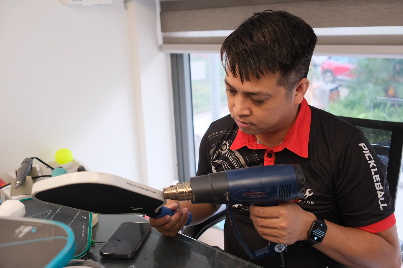 Bên cạnh bán dụng cụ, huấn luyện và tổ chức giải đấu, một nghề mới đang âm thầm phát triển: sửa chữa vợt pickleball. Trong ảnh, anh Đinh Duy Khánh - Chuyên gia sửa chữa vợt pickleball của Swin Care - đang sửa chữa vợt cho khách hàng.