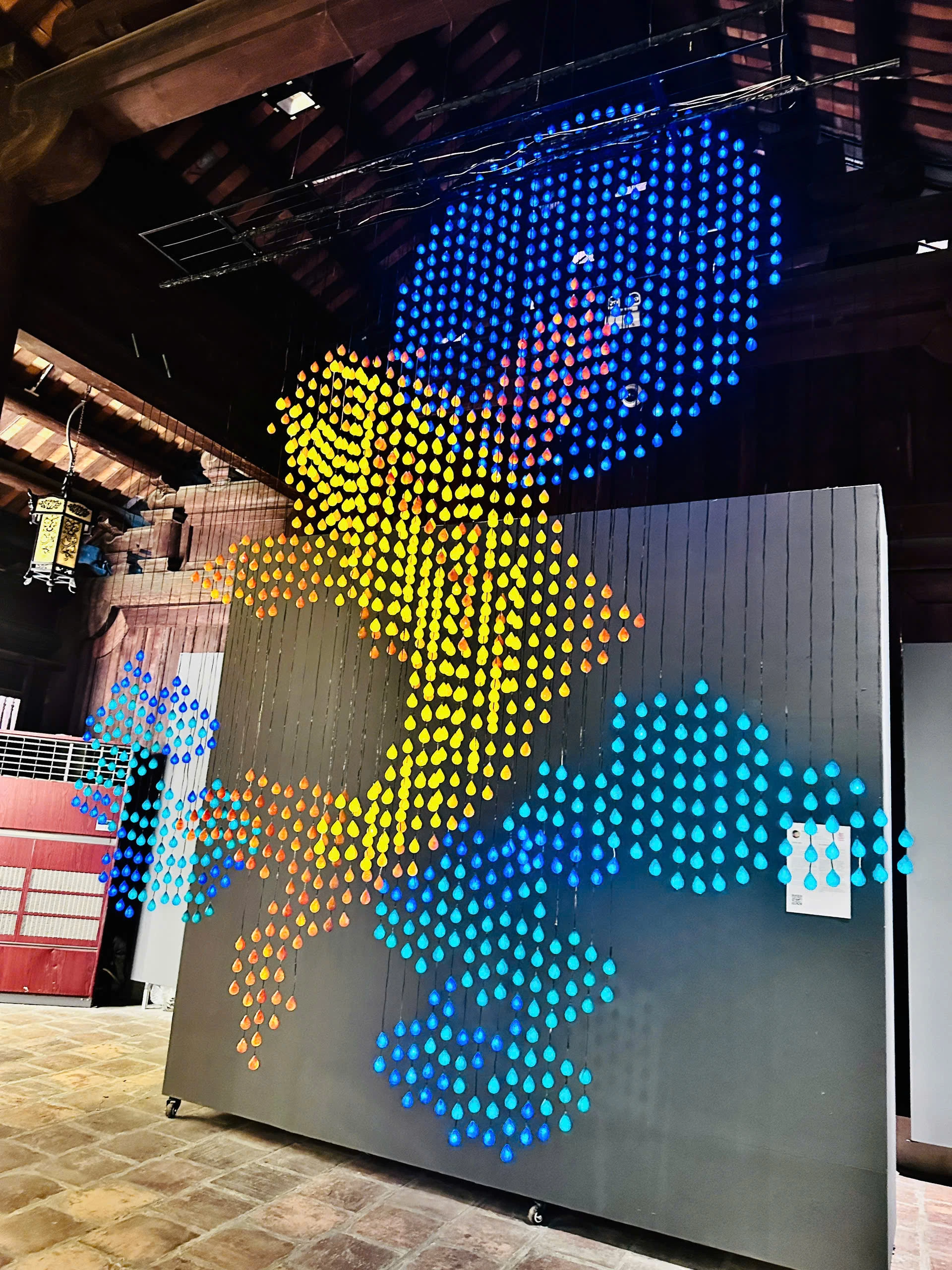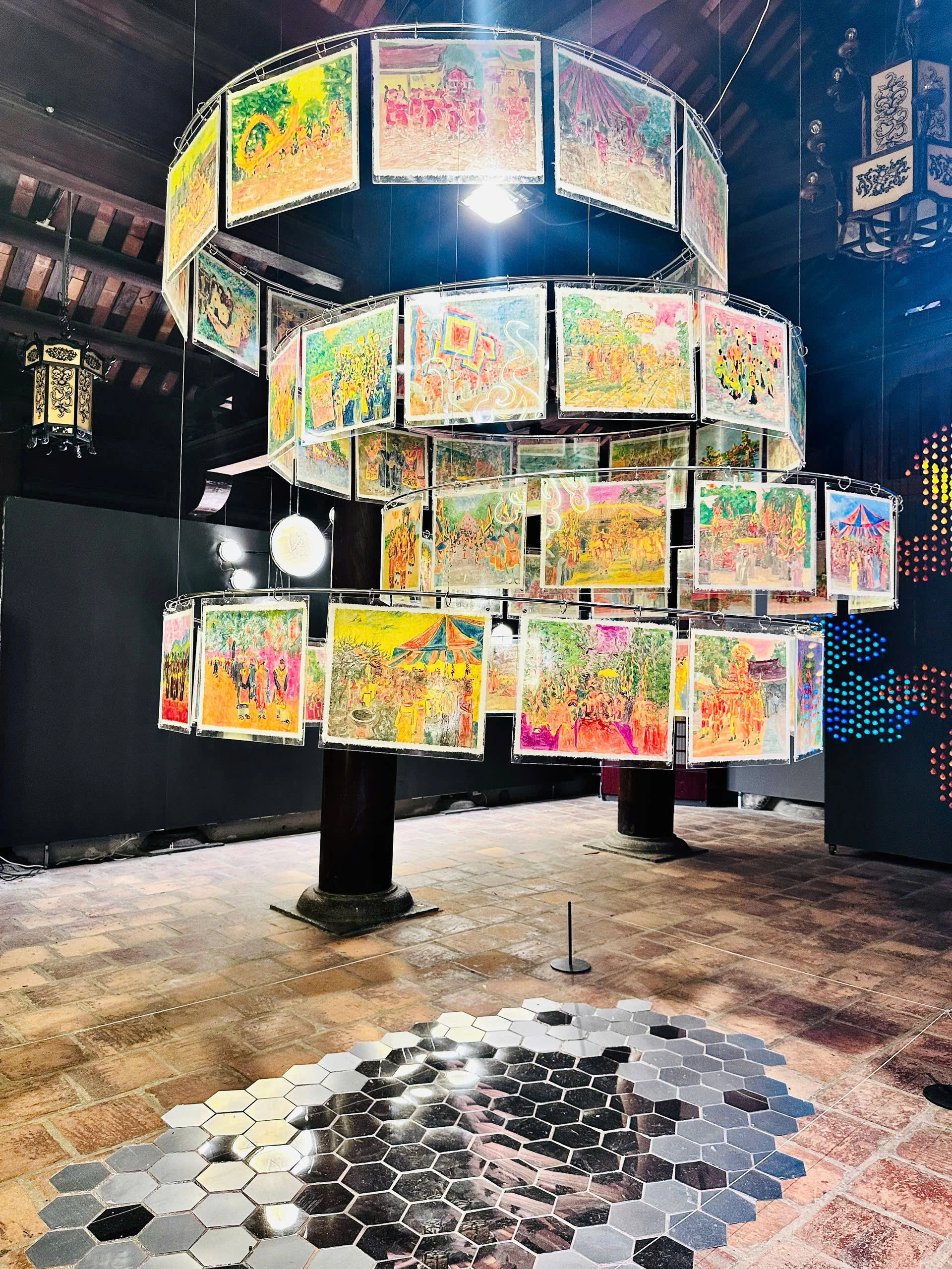 Họa sĩ Lê Thị Thanh lại mang đến một “cuộc hội ngộ” đầy màu sắc qua tác phẩm “Kinh Kỳ Hội”. 59 bức tranh in độc bản được sắp đặt thành một chiếc đèn lồng khổng lồ, soi bóng xuống nền inox gương, tạo ra một không gian vô tận. Đây là một sự thử nghiệm táo bạo về thị giác: chất liệu giấy dó truyền thống đối thoại trực tiếp với sự lạnh lùng của inox công nghiệp. Qua những hình ảnh lễ hội Thăng Long, Lê Thị Thanh không chỉ kể chuyện kinh kỳ, mà còn kể câu chuyện về sự giao thoa văn hóa. Với tâm thế của một người con xứ Thanh luôn hướng về nguồn cội, chị đã tạo ra một “vòng xoáy” thời gian, nơi quá khứ được phản chiếu trong hiện tại, và Đạo học không tách rời khỏi hơi thở của đời sống hôm nay.